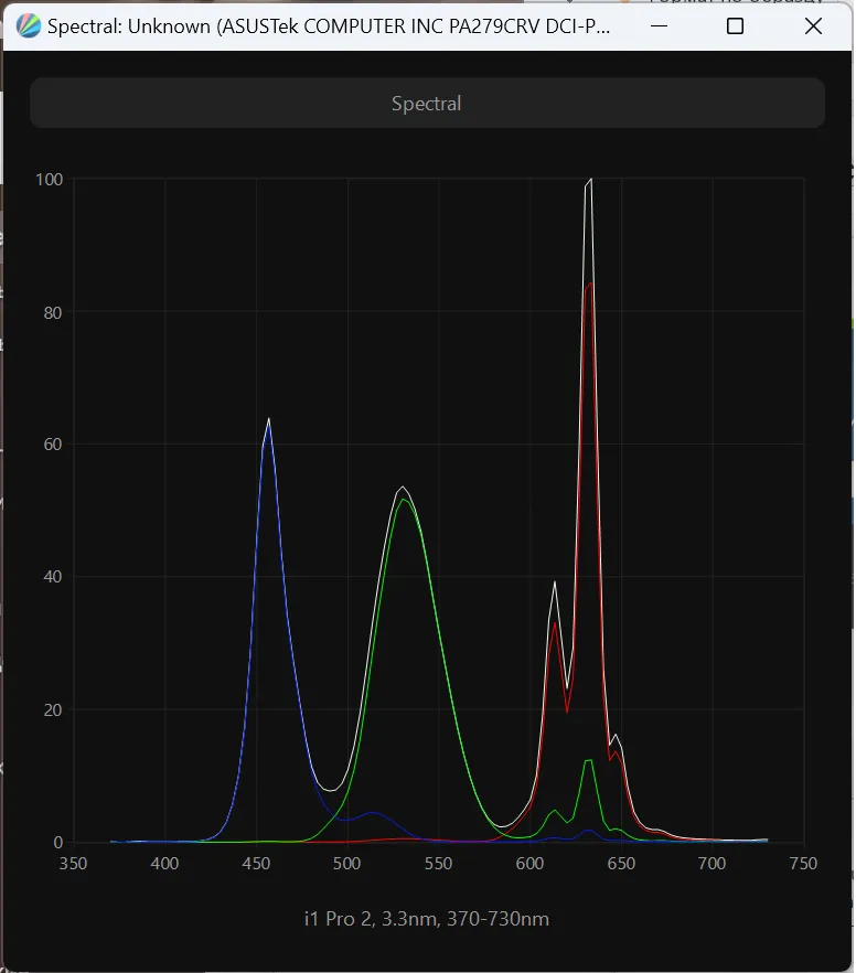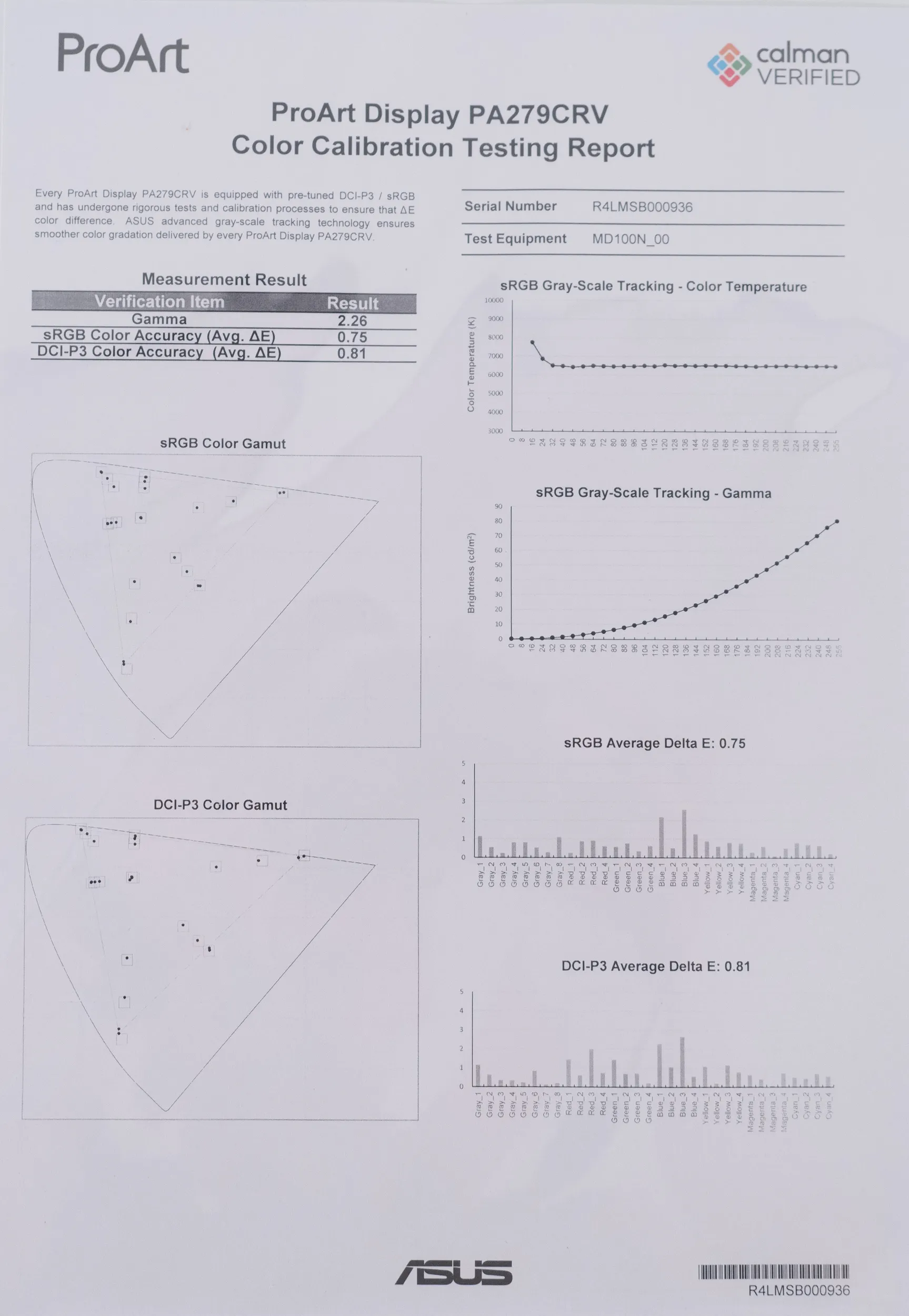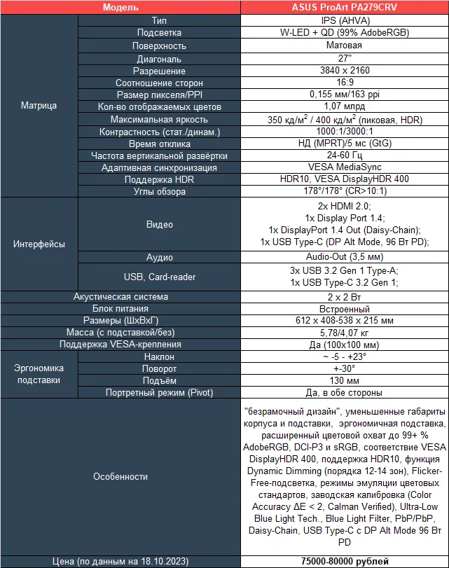 Использование «квантовых точек» (QD) в качестве модификатора спектра свечения расширило цветовой охват панели до уровней в 99 % для всех трёх основных пространств (sRGB, AdobeRGB, DCI-P3) и предоставило возможность для ASUS указать поддержку ещё более широкого Rec.2020, но без упоминания точного результата. На фоне младшего PA279CV с 99-100 % sRGB/Rec.709 это существенный шаг вперёд, но целью новинки являются потребители, которые будут чётко осознавать для чего нужны им эти расширенные возможности. Это крайне важно.