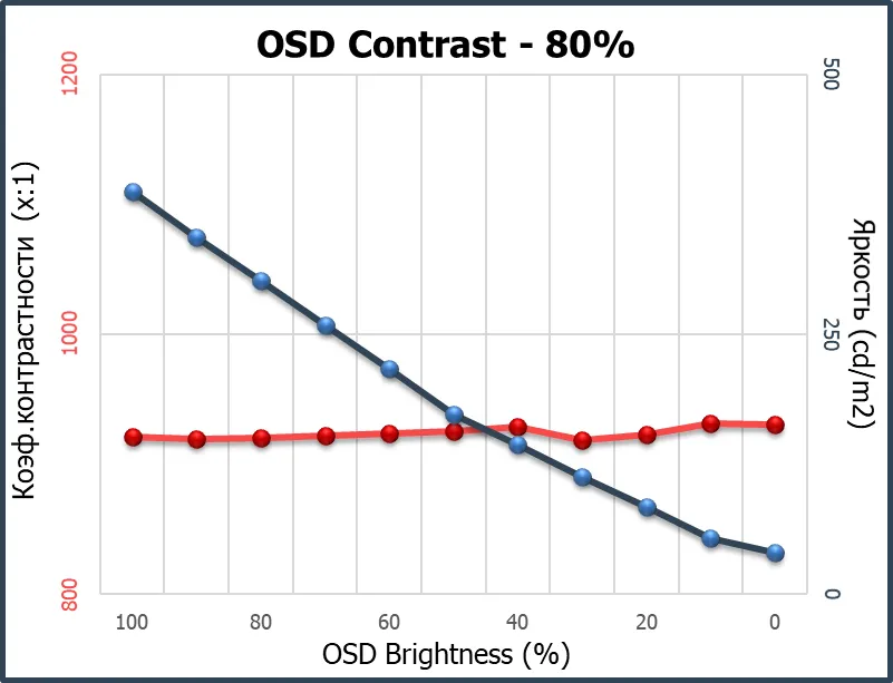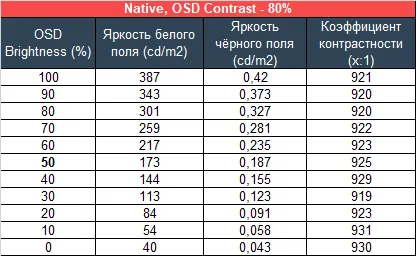 Для изучения стабильности контрастности и диапазона изменения яркости был выставлен режим Racing. Значение Brightness менялось с 100 до 0% с шагом в 10 единиц. Для представленной ниже таблицы измеренные значения были получены через программу HCFR, которая даёт возможность более точно оценить уровень чёрного (три знака после запятой) и соответственно определить достоверный коэффициент контрастности.