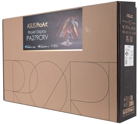 Монитор ASUS ProArt PA279CRV поставляется в небольшой коробке с качественной полиграфией, фотографией дисплея на верхнем стикере и перечислением основных особенностей модели с помощью различных пиктограмм с подписями.