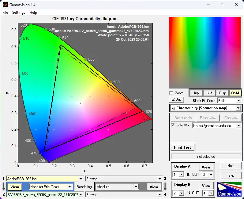 Общую точность цветопередачи по тесту Argyll CMS можно оценить, как среднюю, но причиной тому является действительно широкий цветовой охват, который превосходит даже AdobeRGB, используемый в качестве референса при тестировании.