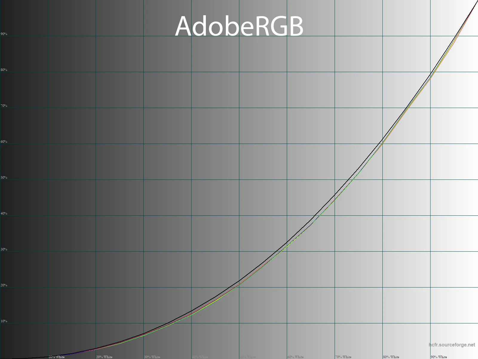 В режимах эмуляции трёх основных стандартов цветовой охват монитора сужается до необходимого уровня. Эмуляция происходит на 95-98 % точно. Гамма-кривые и контрастность изображения соответственно, в случае с режимами sRGB и AdobeRGB, не отличаются от заводских установок. Все ещё наблюдается лёгкое усиление контрастности картинки. Но проблем с точкой белого и балансом серого нет.