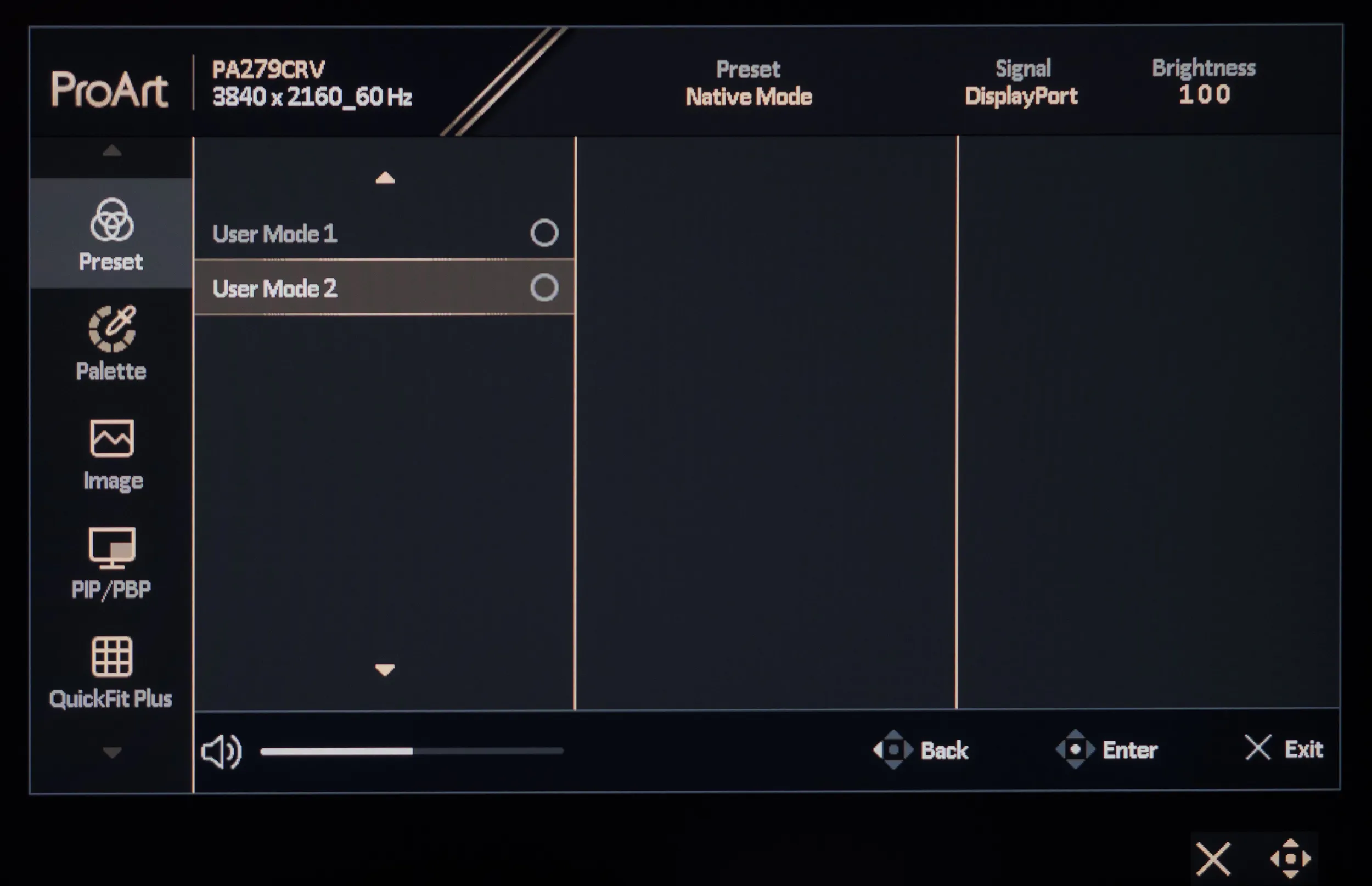В ASUS PA279CRV предустановлено семь основных режимов и два для пользовательской настройки с ограниченным набором доступных параметров. Именно поэтому для ручной настройки и последующей калибровки мы использовали заводской режим Native.