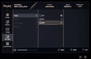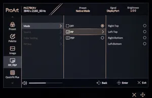 Под настройку функций PiP/PbP производитель выделил отдельный раздел. Доступны различные виды размещения изображения со второго источника, а также цветовые настройки для него.