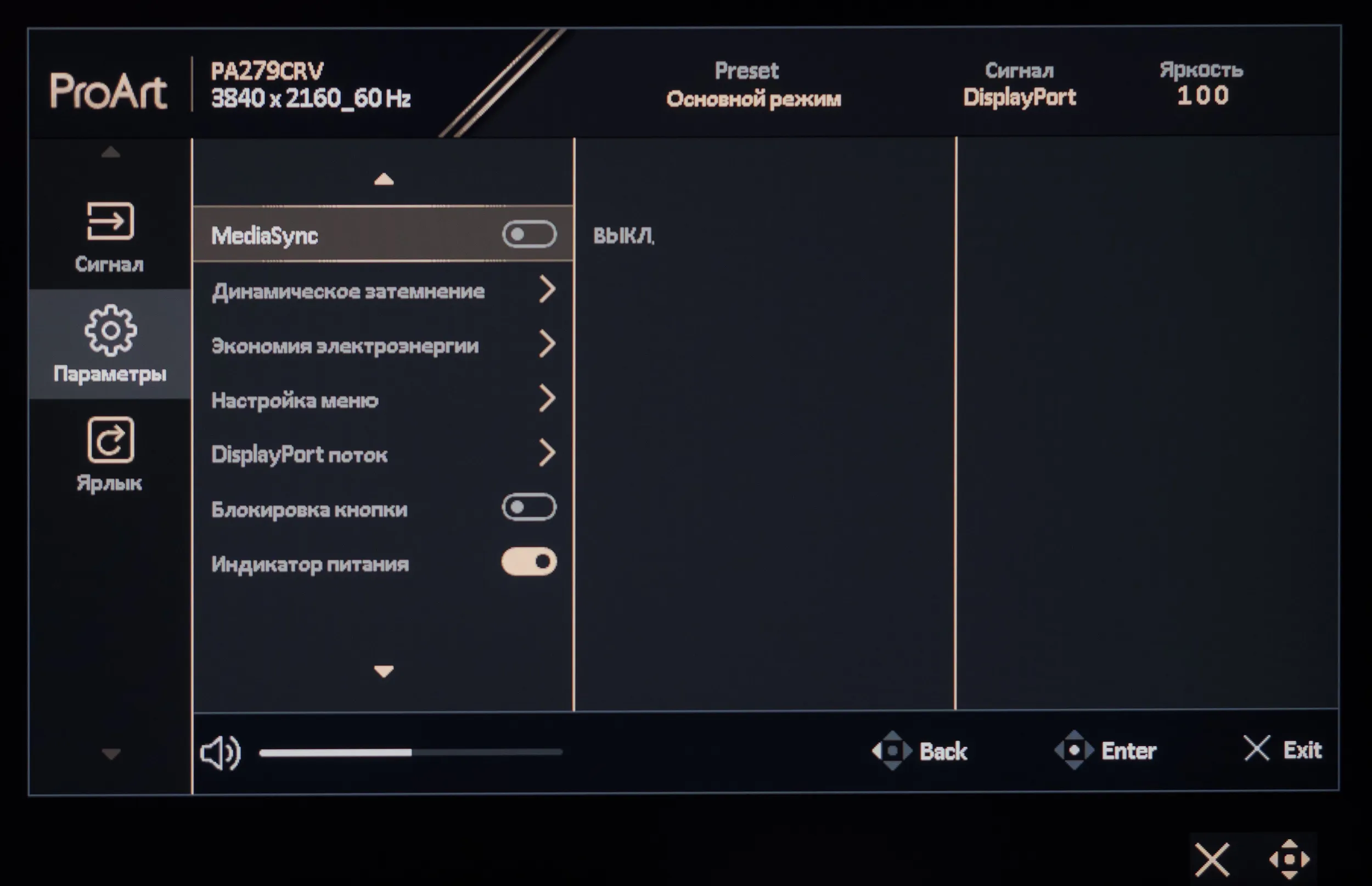 Раздел Settings, пожалуй, самый крупный в меню монитора и содержит в себе параметры, в основном не связанные с качеством изображения на экране. Среди доступных опций: настройка внешнего вида и положения OSD-меню, выбор языка локализации (русский в наличии, перевод вполне адекватный, но не полный), блокировка клавиш управления, выключение индикатора питания, определение варианта работы DP, настройка уровня громкости и выбор источника аудиосигнала.