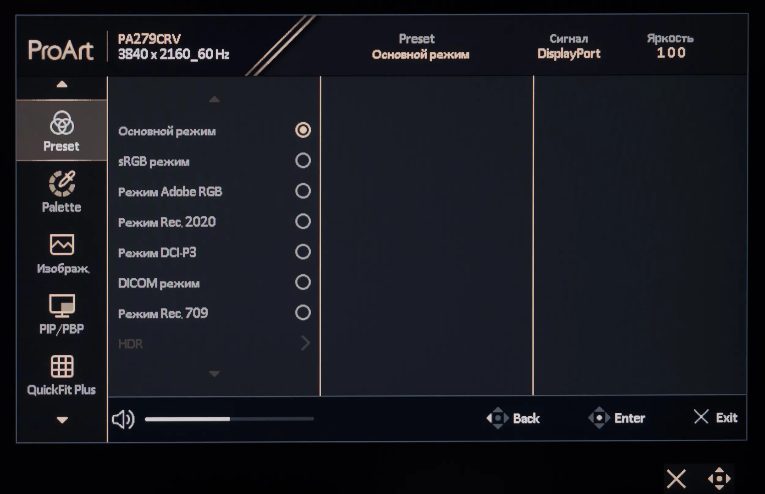 В первом — под названием Preset — пользователю предлагается выбрать один из семи профессиональных режимов (большая часть которых являются режимами эмуляции различных цветовых пространств, но каждый со своими ограничениями настройки… увы), два пользовательских и возможность выбора формата работы HDR после его активации в системе.