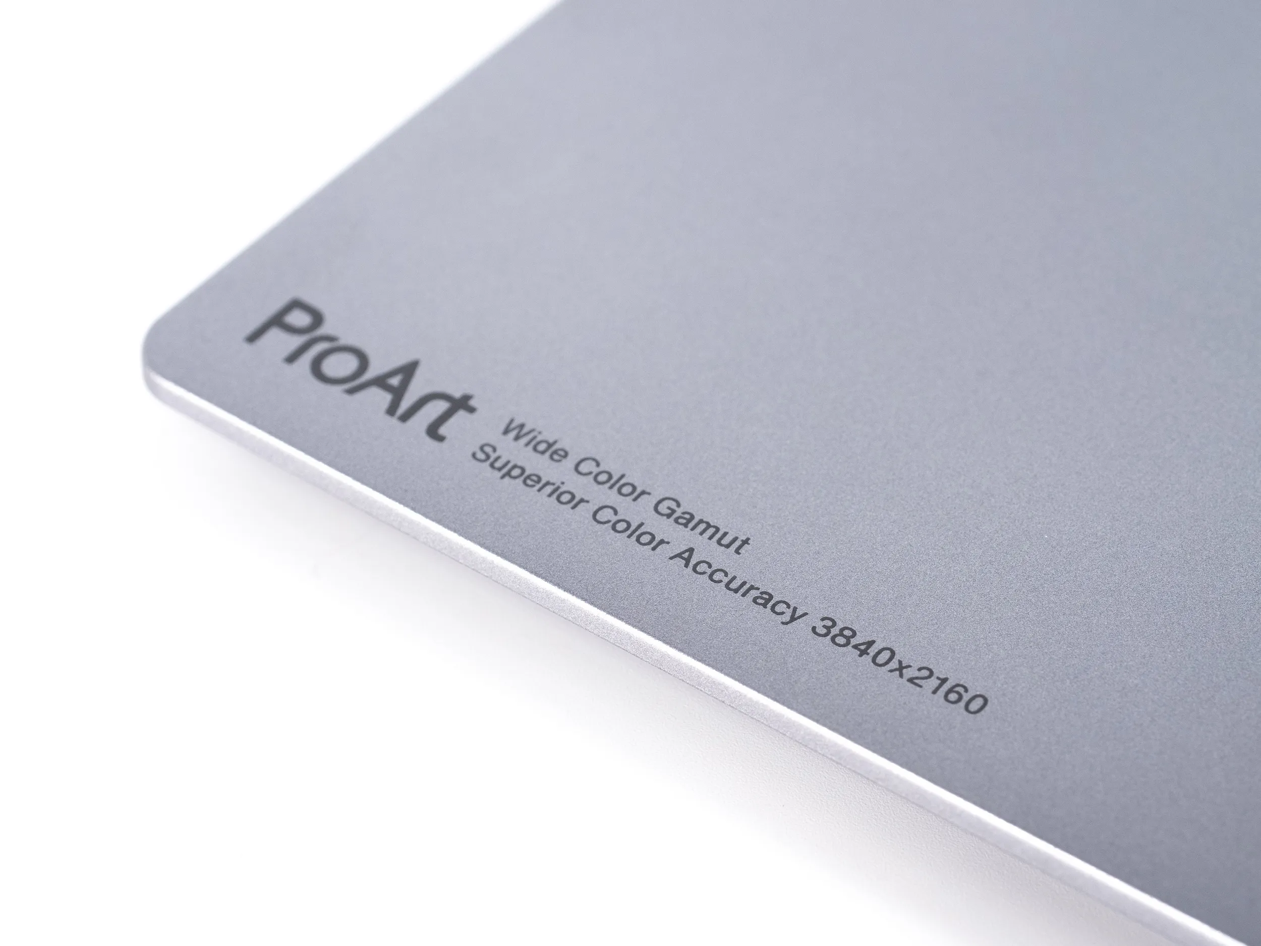 На корпусе ProArt PA279CRT присутствуют логотип бренда и большое буквенное обозначение серии. На подставке есть ещё одна отсылка к ProArt, а также указание на широкие возможности цветовоспроизведения, высокую точность цветопередачи и разрешение 3840 х 2160 пикселей.