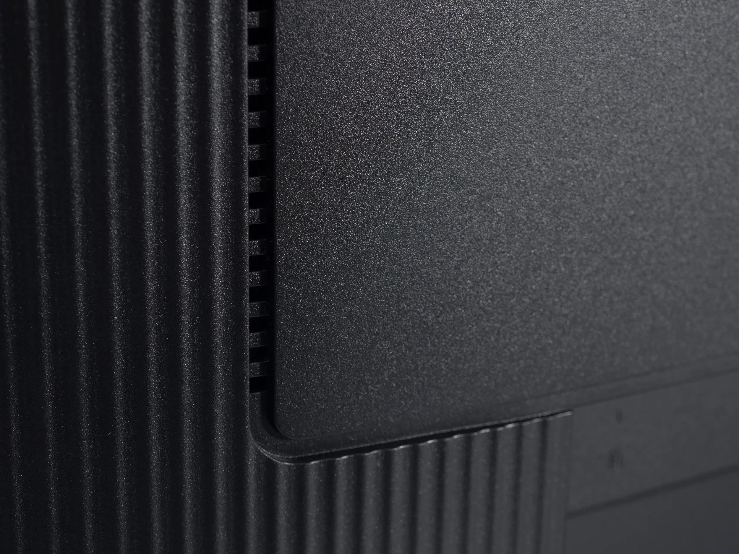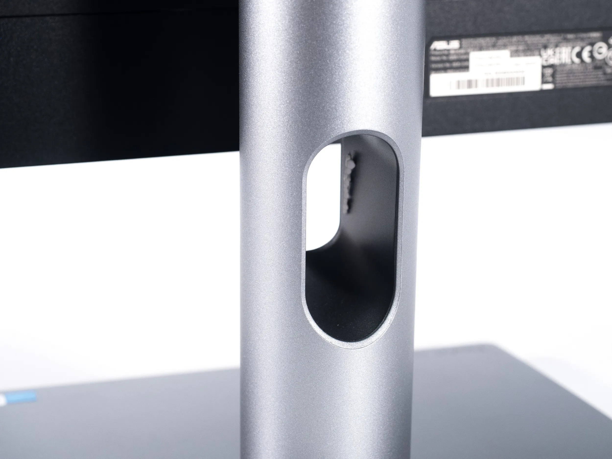 Круглая утончённая стойка внесла ощутимые изменения внешнего вида новинки, а в качестве системы прокладки кабелей в ней сделан специальный вырез овальной формы. Подход к «кабель-менеджменту» самый простой, но хотя бы так, чем ничего.