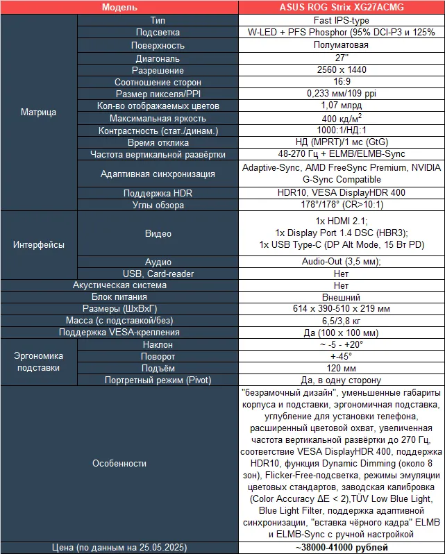 Добравшаяся до РФ новинка от ASUS в лице ROG Strix XG27ACMG является прямым ответом компании на десятки предложений от ранее неизвестных «братьев-китайцев» среди игровых 27-дюймовых WQHD-мониторов с частотой от 240 Гц. Пожалуй, герой обзора — первый доступный монитор от столь крупного бренда, который точно стоит каждого вложенного в него рубля (за актуальные на момент этого обзора 40-42 тысячи — так уж точно).