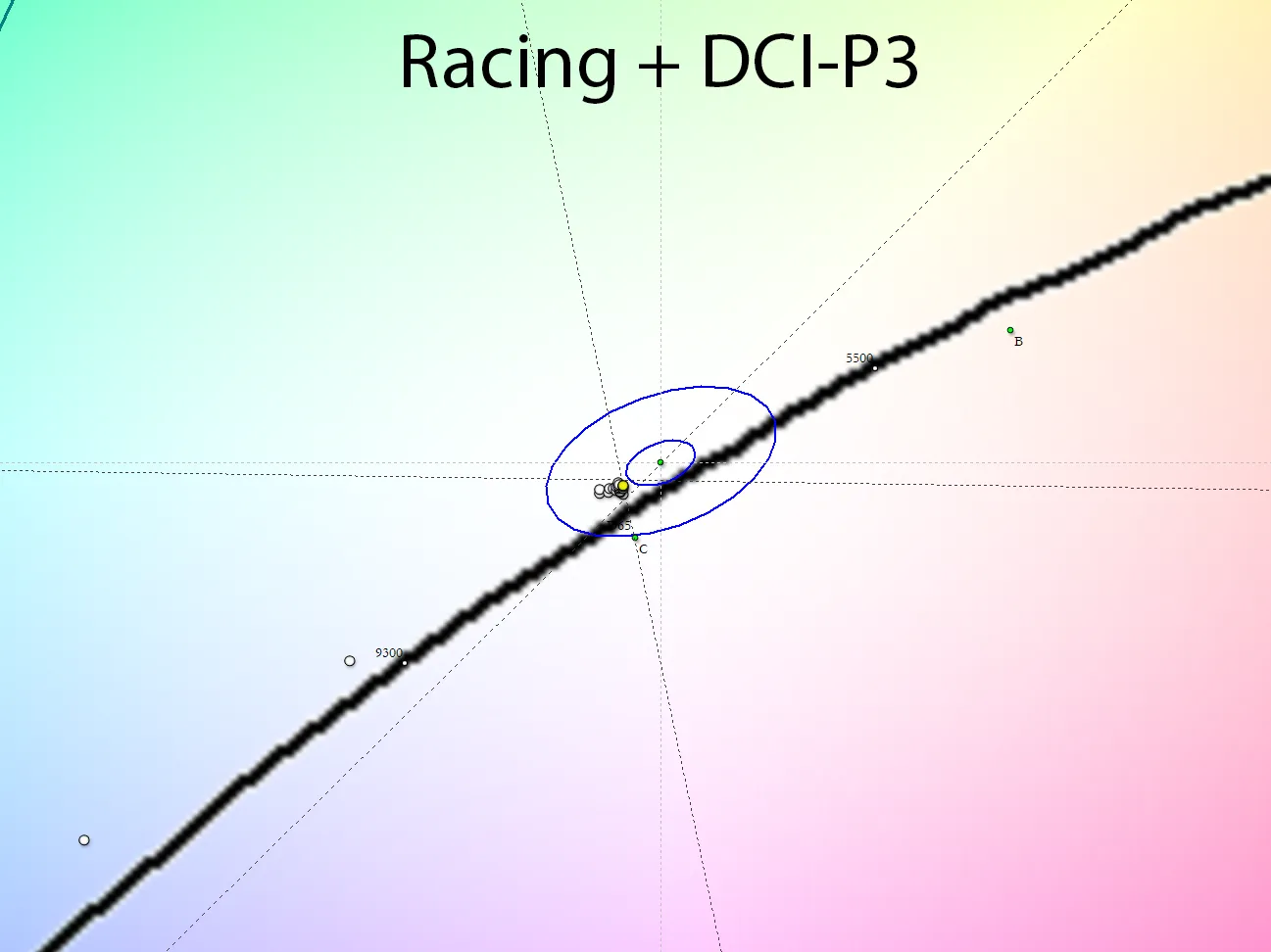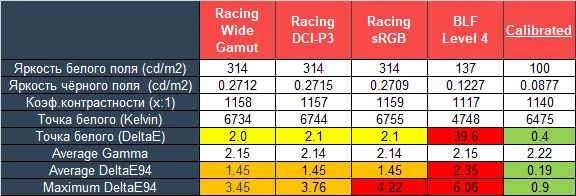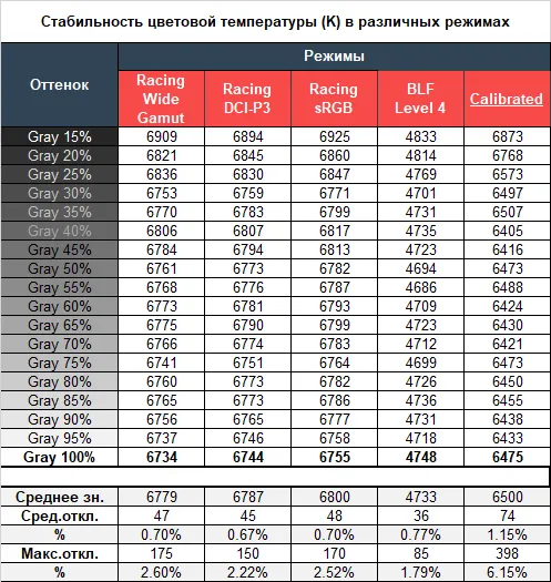 Уровень стабильности цветовой температуры оказался на высоком уровне во всех протестированных пресетах. Лишь в Racing + WG после калибровки среднее значение перешло за границы одного процента, а максимальное стало чуть выше 6%. Но даже такой результат всё ещё остаётся высоким.
