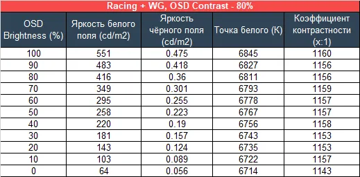 Для изучения стабильности контрастности и диапазона изменения яркости был выставлен режим Racing с полным цветовым охватом. Значение Brightness менялось с 100 до 0% с шагом в 10 единиц. Дополнительно мы проверили стабильность цветовой температуры точки белого в ходе регулировки яркости. Для потребителей откалибровавших монитор, но сталкивающихся с необходимостью постоянной коррекции яркости — это крайне важный показатель качества монитора.