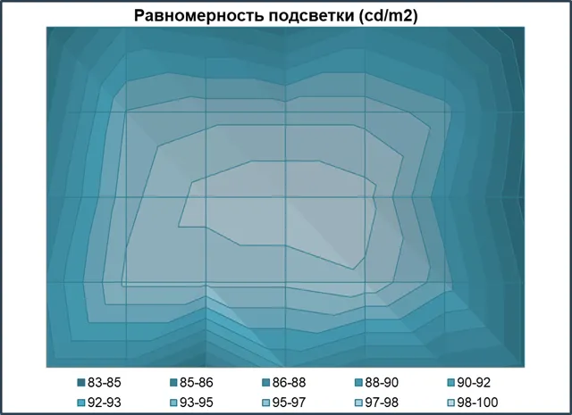 По представленной диаграмме поверхности можно наглядно увидеть, как сосредоточен уровень яркости по полю матрицы. Самая светлая зона средняя по размеру, а яркость достаточно быстро снижается к краям панели, особенно это заметно в правой зоне экрана.