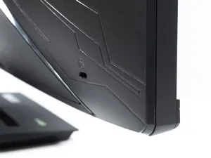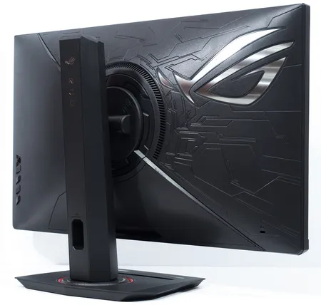 Декорированию монитора уделено немало внимания — габаритная задняя часть разделена по диагонали надвое, а вариантов одного только пластика тут три, с разной фактурой: основной матовый тёмно-серого цвета с ребристой поверхностью, пара металлизированных вставок (исполняют роль подсвечиваемого логотипа линейки ROG Strix) и полуматовая поверхность с выгравированным рисунком.