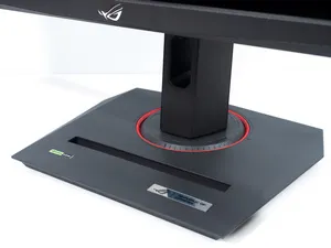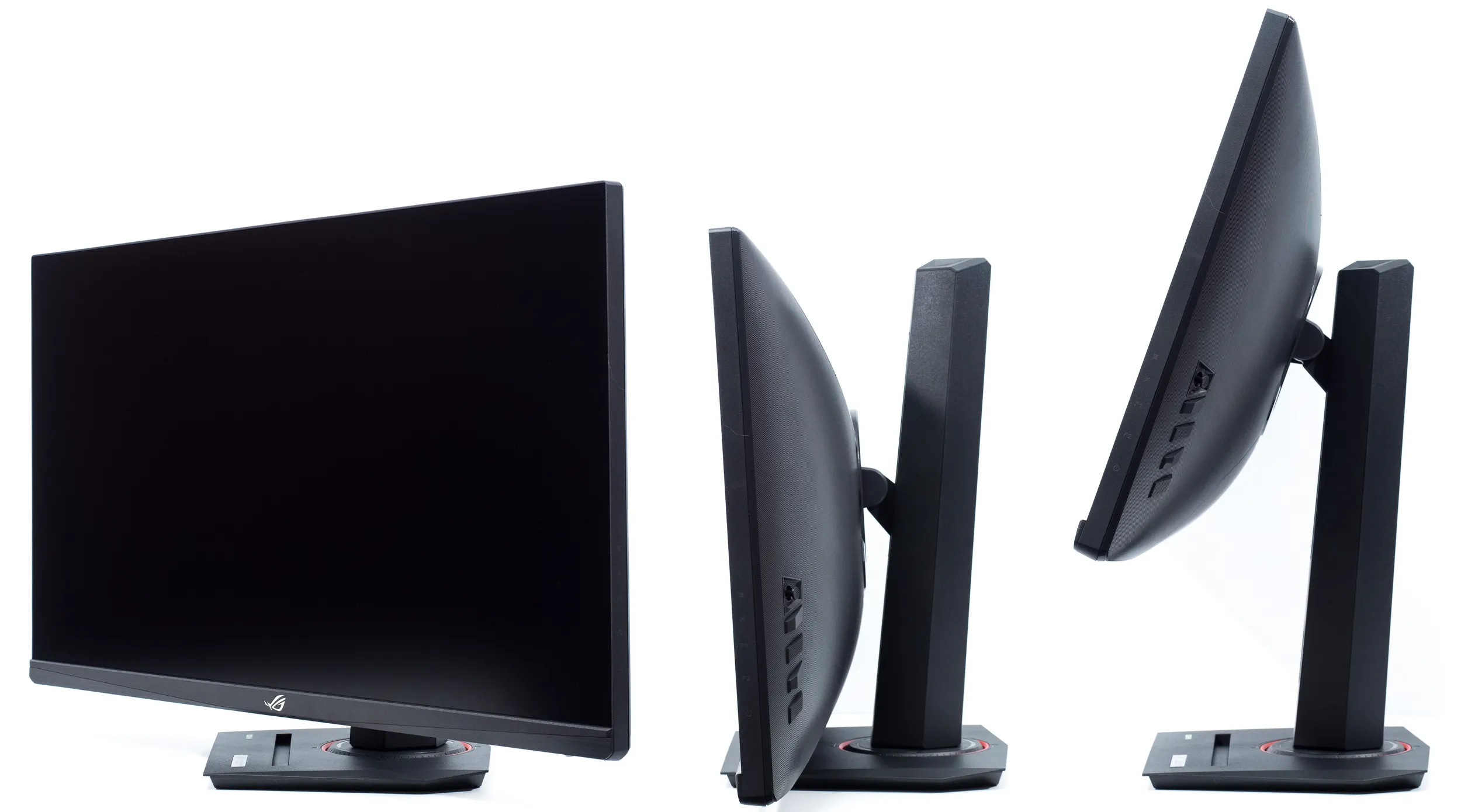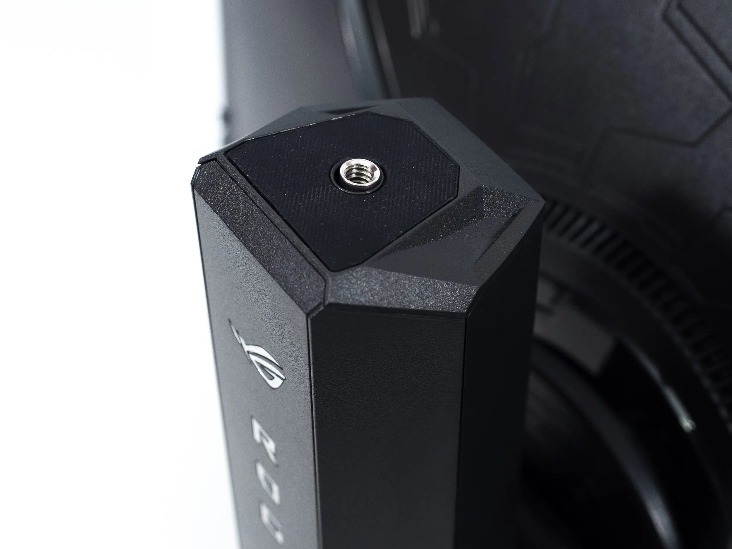 В самом корпусе монитора ASUS, cложные формы, переплетённые друг с другом, с различным по фактуре и цвету пластиком, моментально создают образ дорогого и нишевого продукта, нацеленного преимущественно на игровую аудиторию. Используется обновлённая система внешней подсветки Aura RGB, но отсутствуют цветные декоративные элементы корпуса — максимально строго и практично.