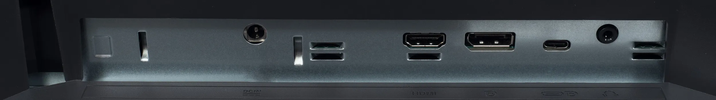 В задней части монитора расположились все основные интерфейсы для подключения, ориентированные вниз. Подключать кабели максимально удобно — спасибо возможности переворота корпуса в портретный режим.