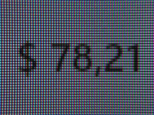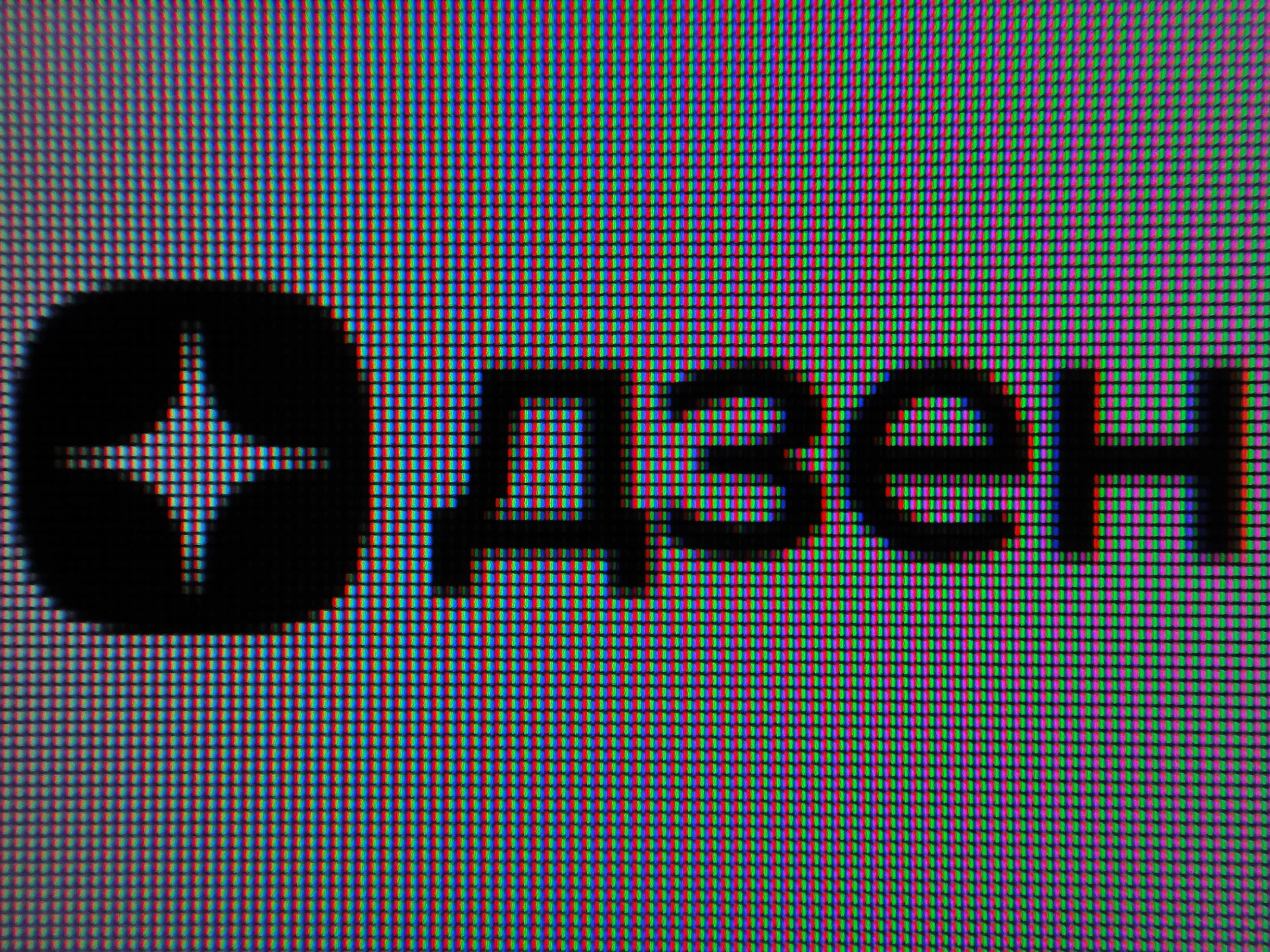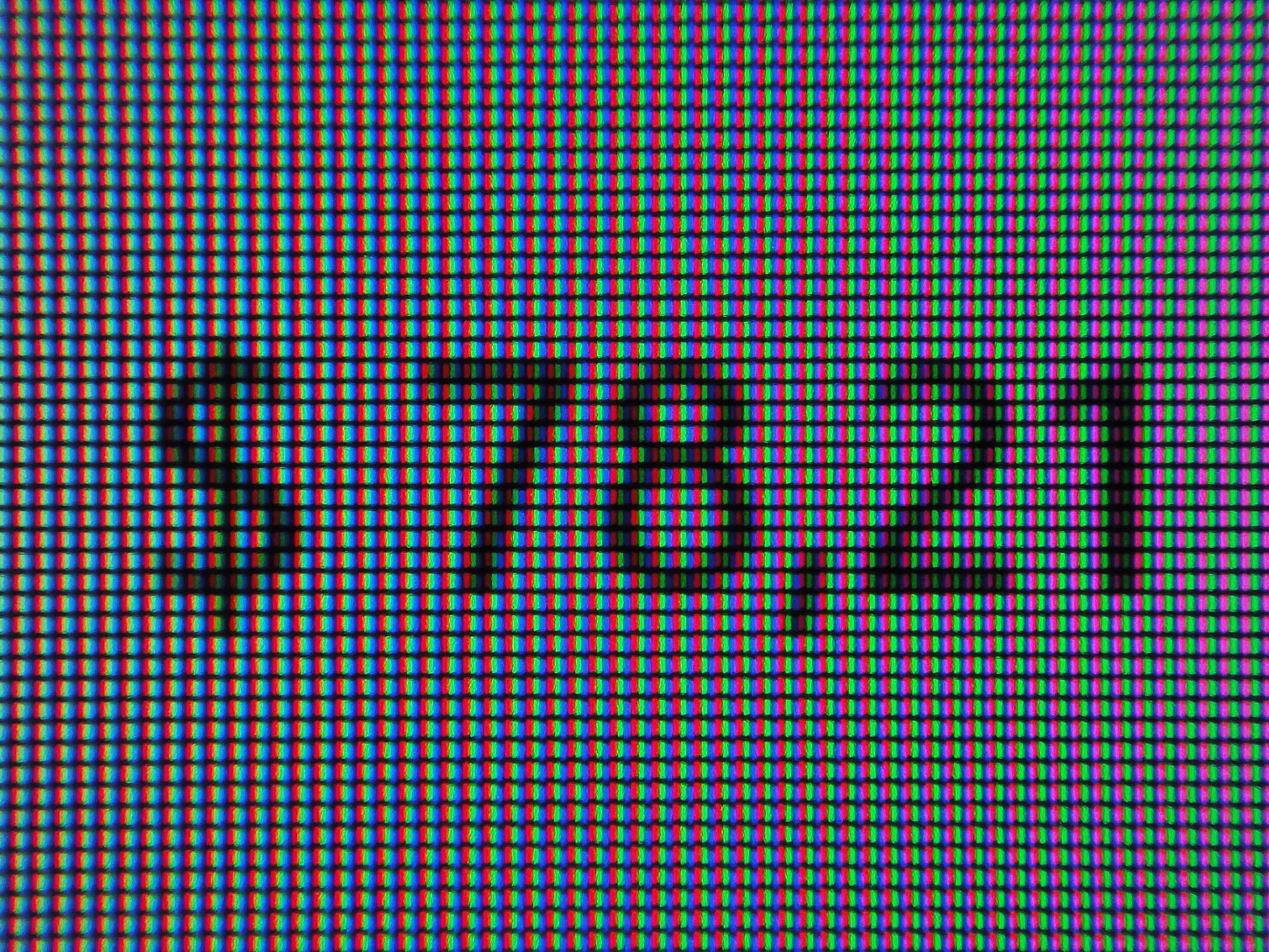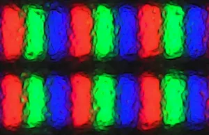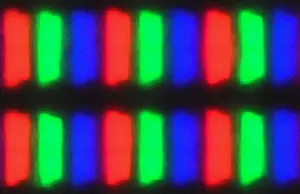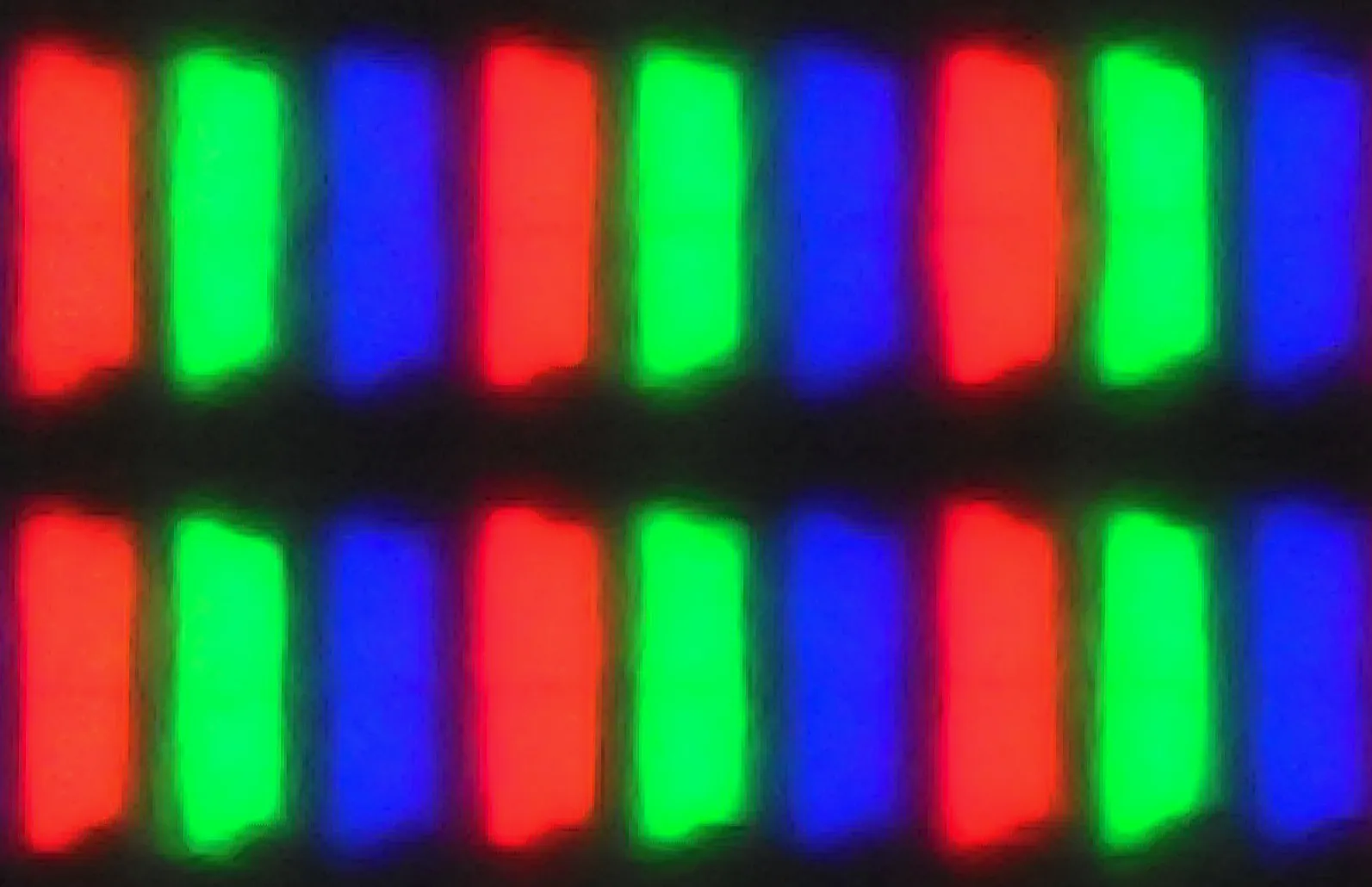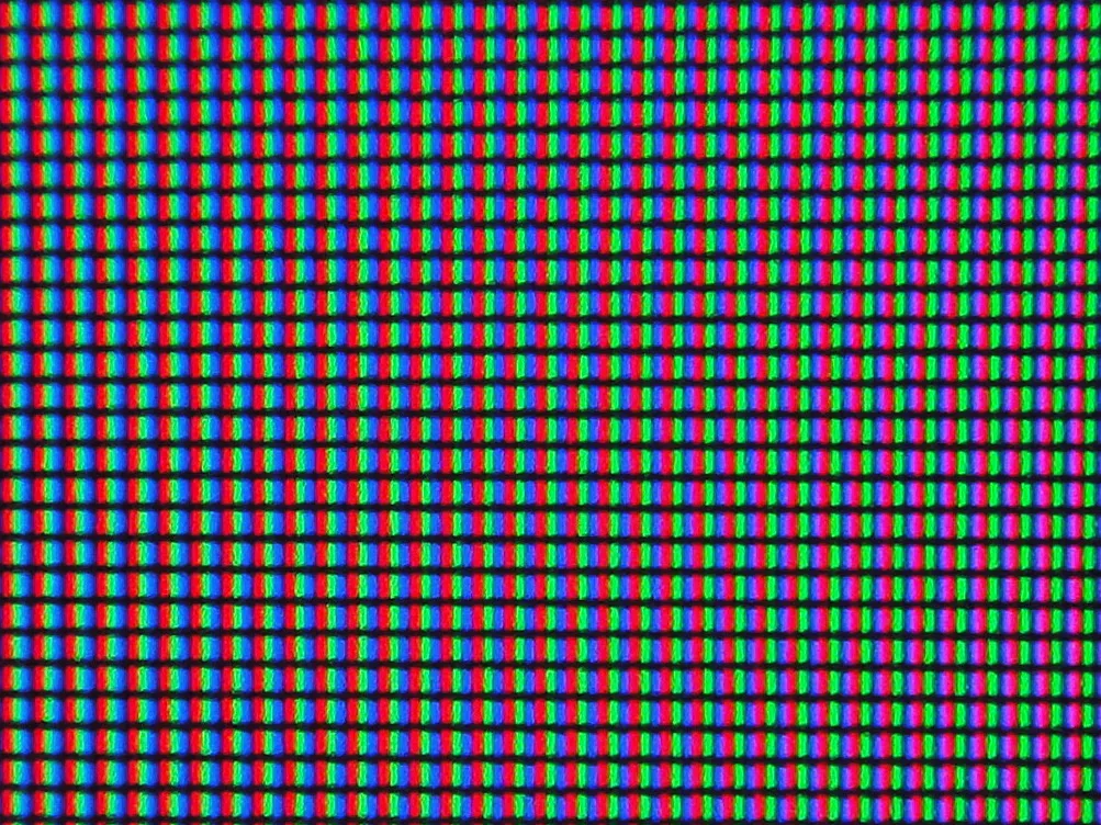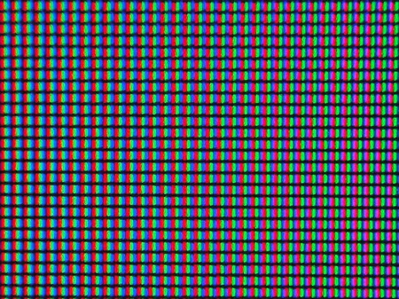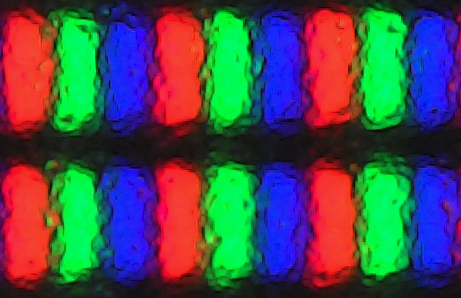 Видна классическая RGB-структура. По макрофотографиям, представленным выше, вы можете увидеть пиксельную структуру и защитную плёнку — снимки с разной областью фокусировки одного и того же сегмента изображения.
