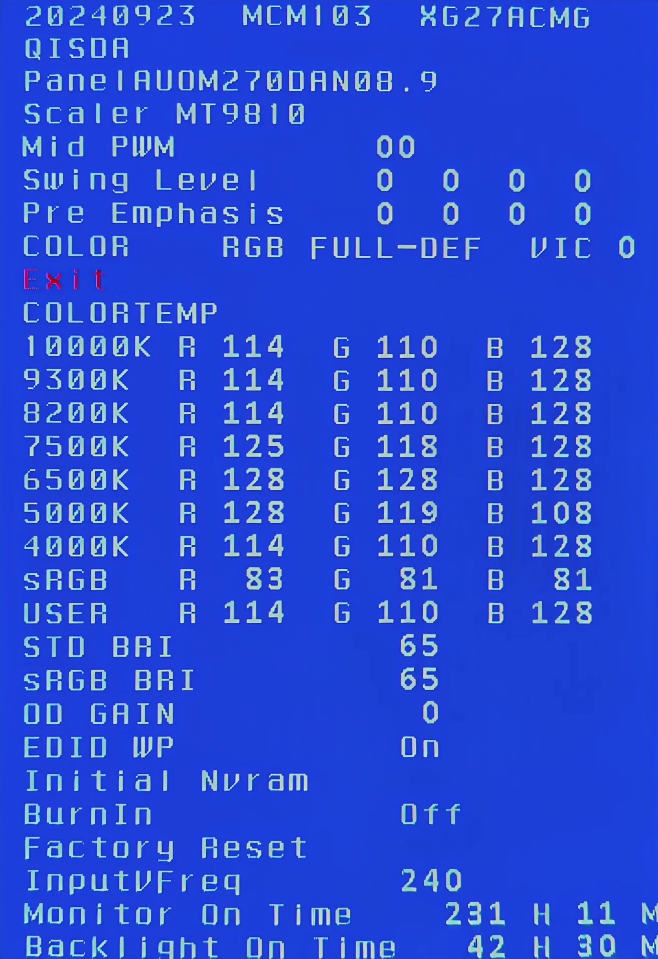 Благодаря полученному доступу в сервисное меню мы смогли подтвердить версию прошивки и её дату, модели матрицы и используемого в мониторе скалера картинки. Доступны другие информационные параметры, а также значения RGB для предустановленных режимов цветовой температуры. Можно поменять базовую яркость для стандартного режима Racing и для режима эмуляции sRGB.