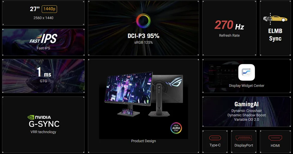 В новинке используется скоростная Fast IPS матрица с увеличенной частотой вертикальной развёртки до 270 Гц, что на 30 Гц выше, чем у большинства конкурентов, но на этих же 30 Гц ниже, чем у предшественника в лице XG27AQMR. Заявленное время отклика модели составляет привычные 1 мс, полученные по методике GtG.