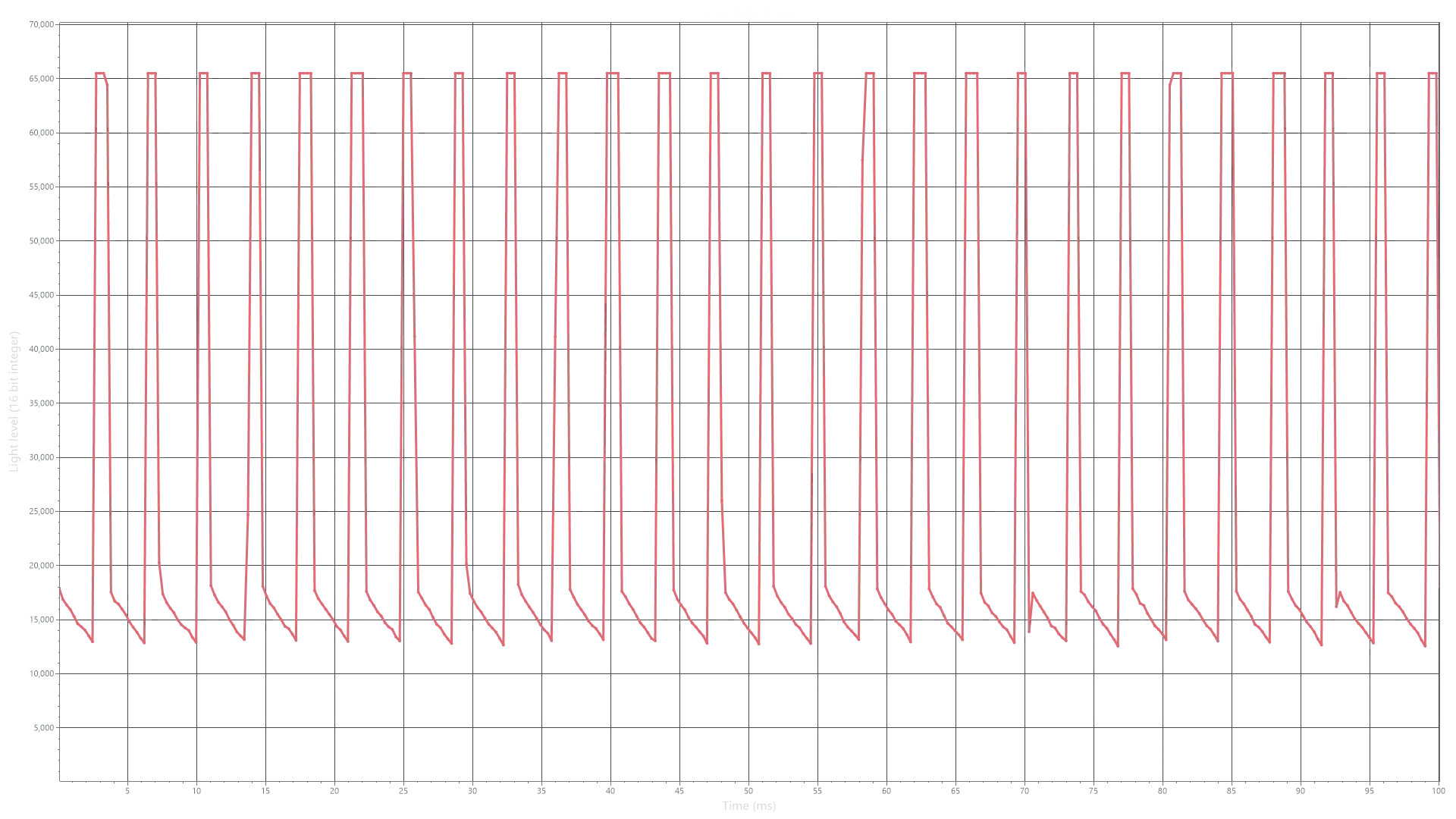 Если же активировать режим ELMB/ELMB-Sync, то подсветка будет мерцать на уровне частоты вертикальной развёртки монитора. Выше предоставлен пример замера на частоте 270 Гц при измерении белого поля. На участке в 100 мс отчётливо видно 27 выключений подсветки за данный период. Такой вариант в обязательном порядке приведёт к визуальным улучшениям на экране (особенно в играх), но и нагрузка на глаза и голову возрастают во много раз. Пускай у каждого тут будут свои выводы.