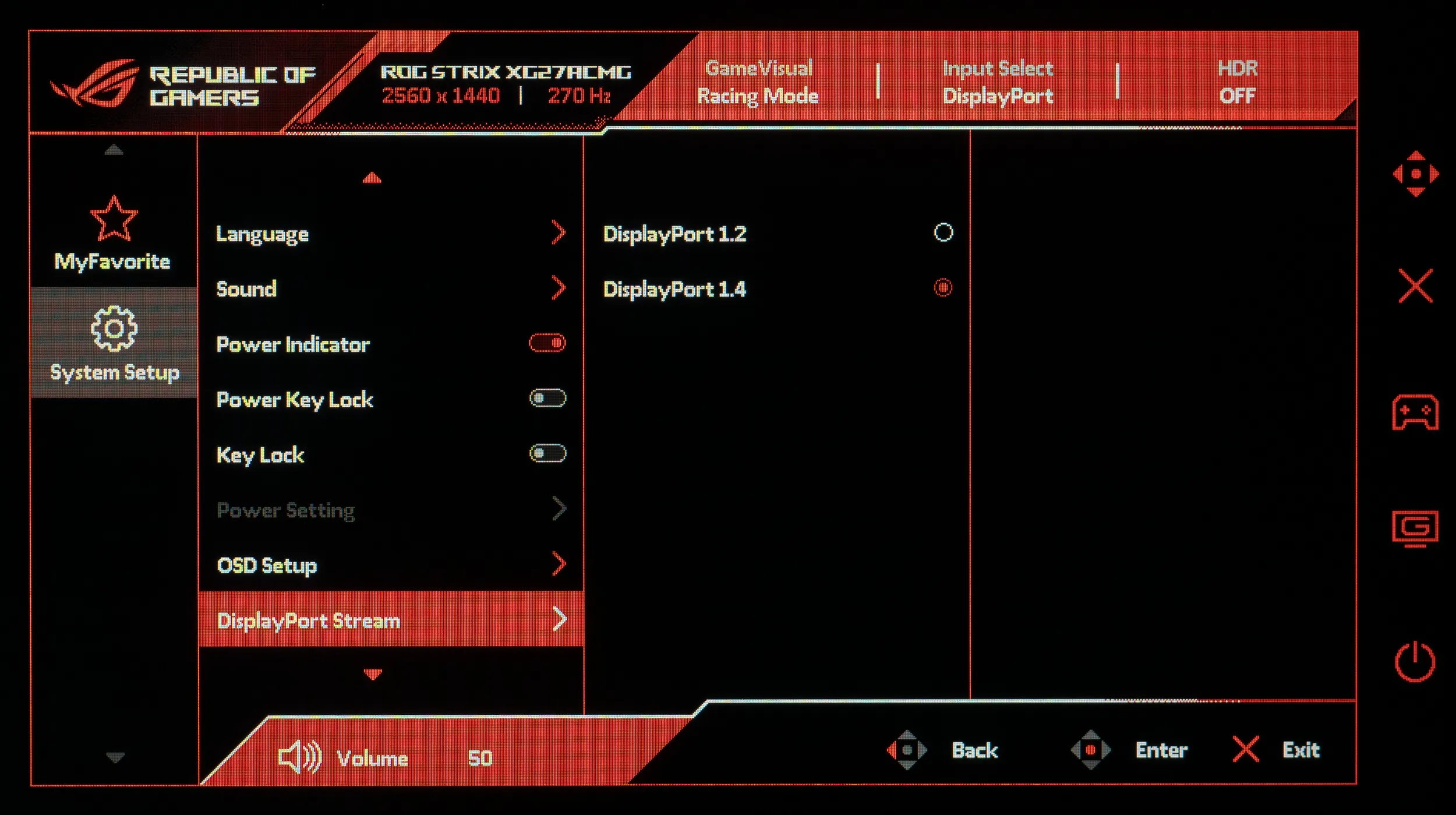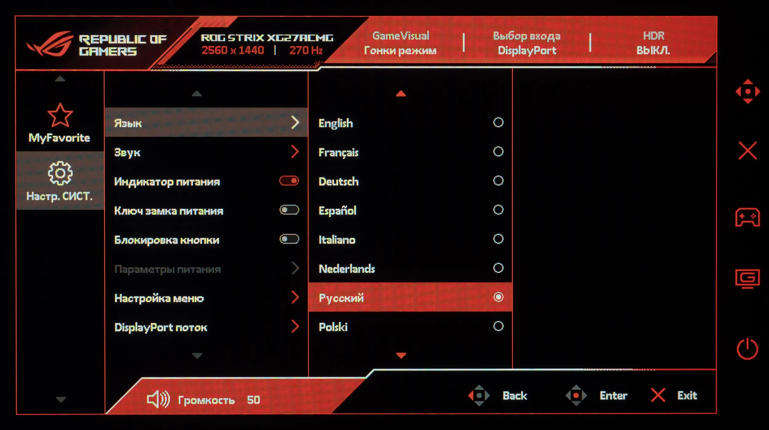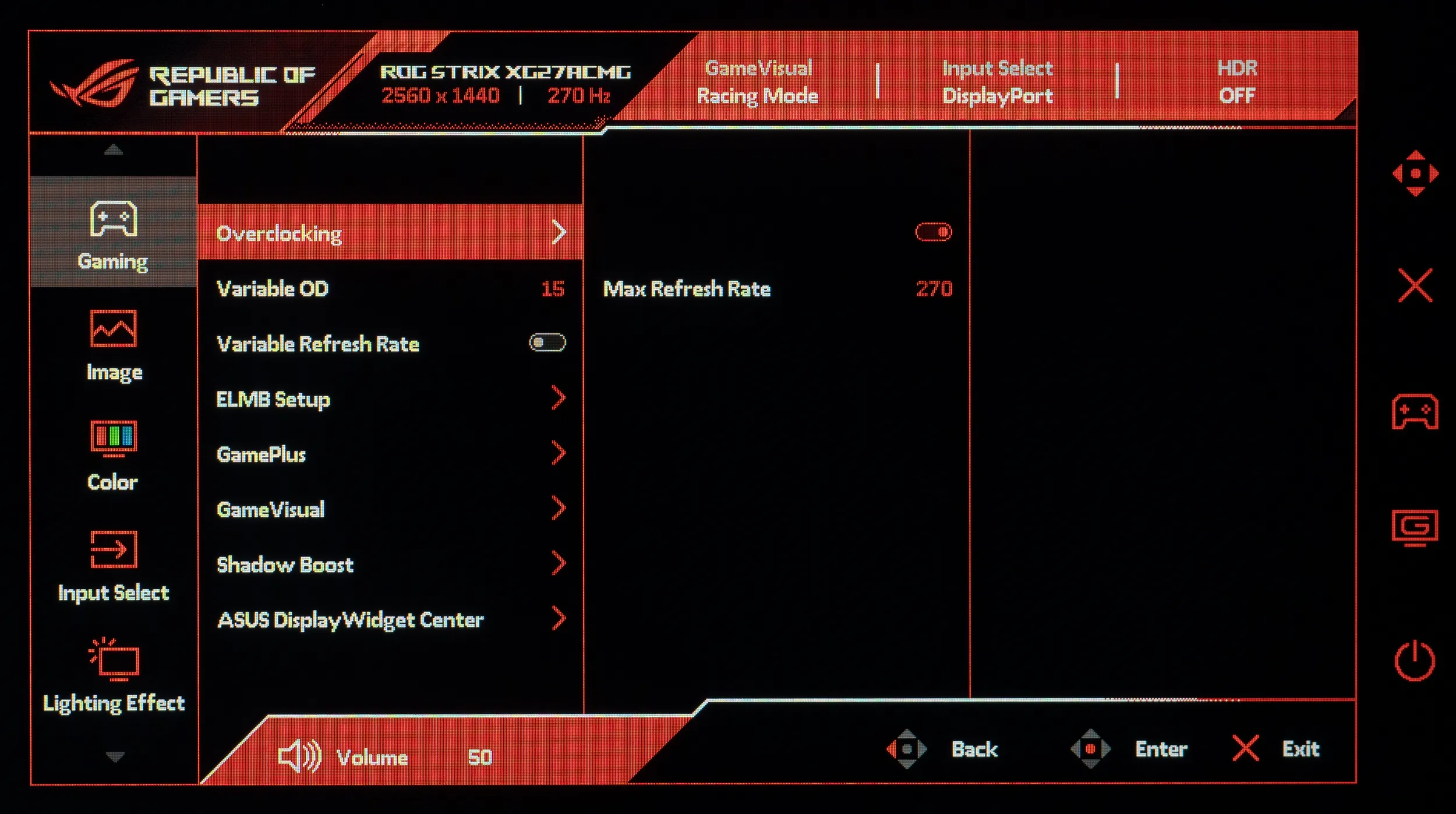 Говоря про игровые характеристики, производитель указал время отклика 1 мс по стандарту GtG и ту максимальную частоту в 270 Гц, для получения которой, правда, требуется активация разгона и выбор необходимого значения (260 или 270 Гц).