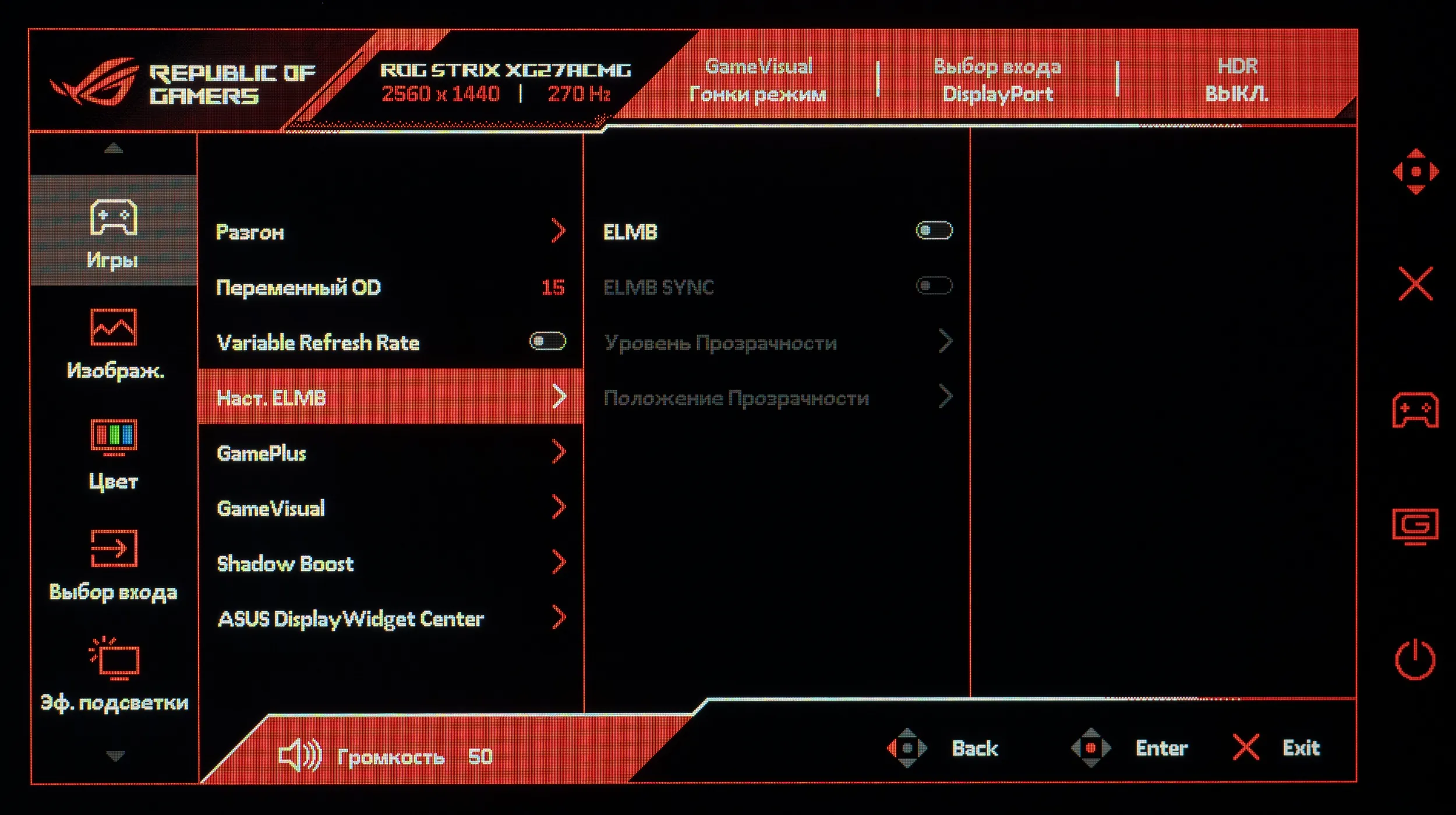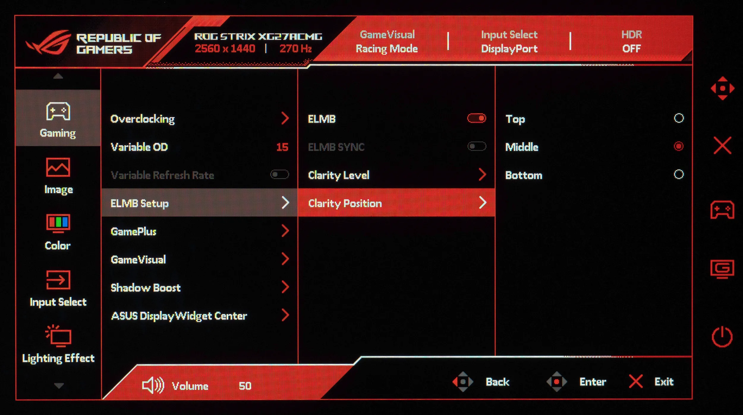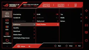 Также у монитора есть технология вставки «чёрного кадра» ELMB-Sync второго поколения с возможностью ручной настройки: есть параметры Clarity Position (отвечает за время возникновения «чёрного кадра») и Clarity Level (отвечает за ширину импульса «чёрного кадра» и соответственно яркость сцены).