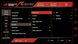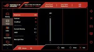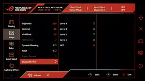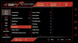 В арсенале монитора также присутствуют технология высветления теней Shadow Boost, набор наэкранных виджетов GamePlus и большое разнообразие режимов GameVisual. Присутствует небольшой выбор режимов работы встроенного скалера, а также пресеты Blue Light Filter для снижения синей составляющей спектра за счёт регулировки уровня RGB Gain.