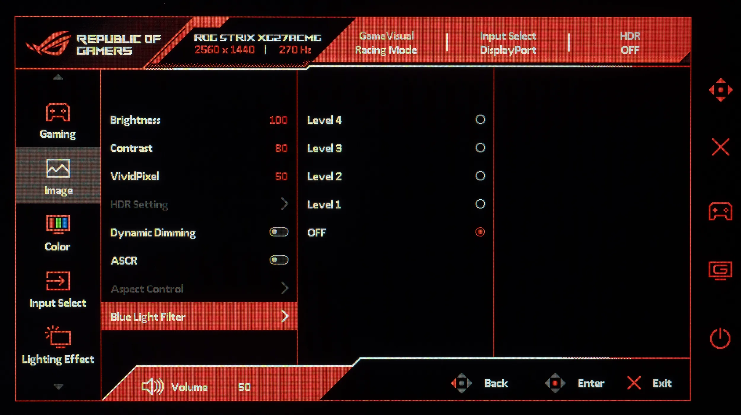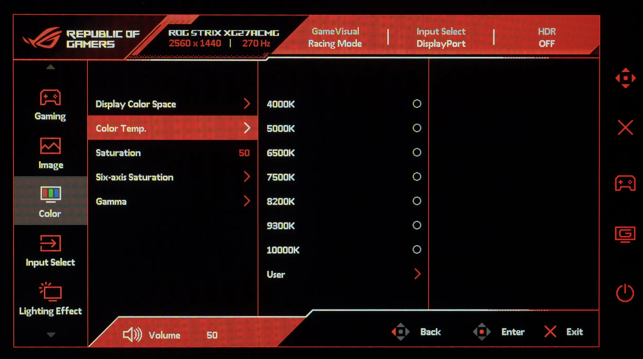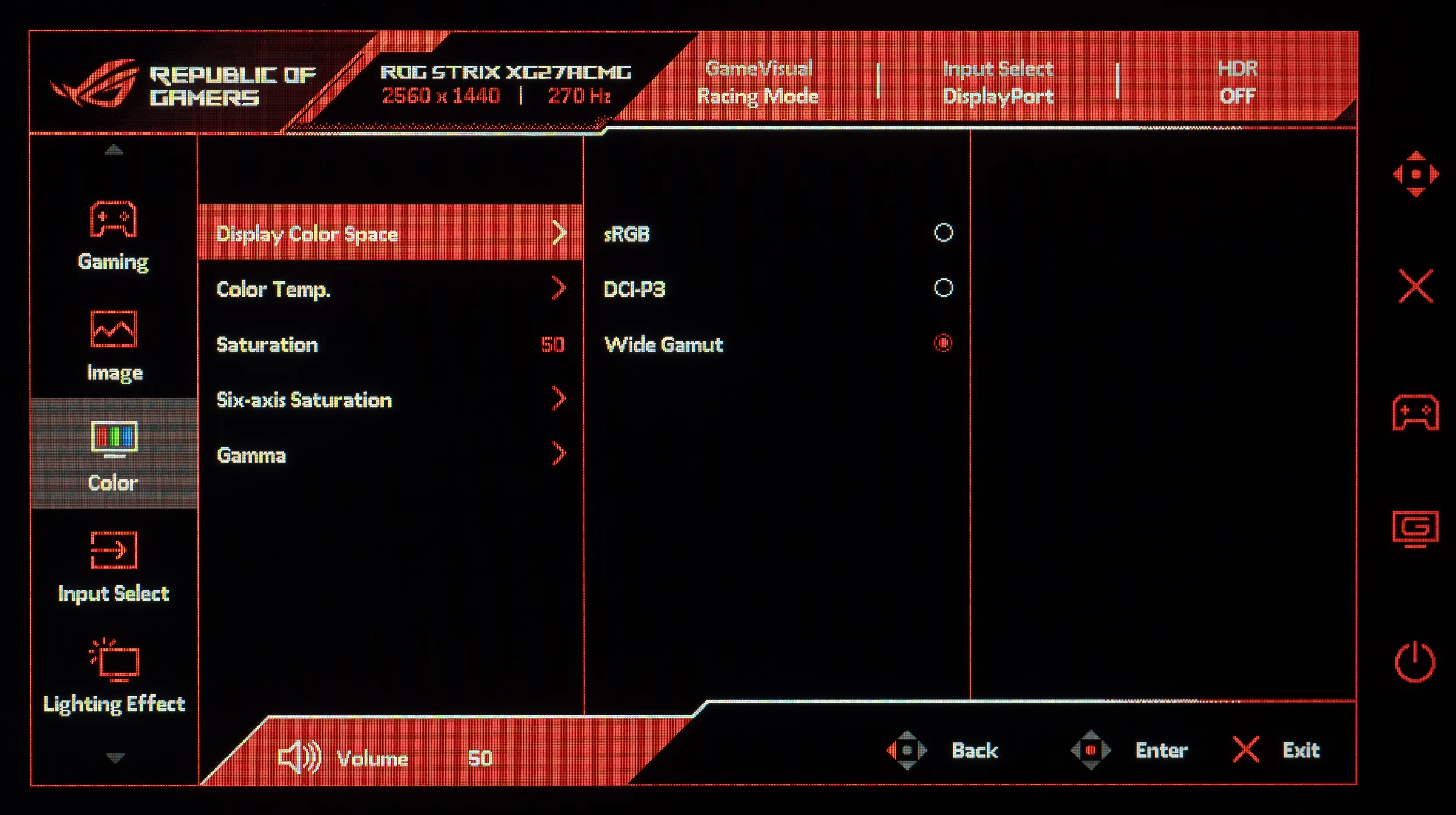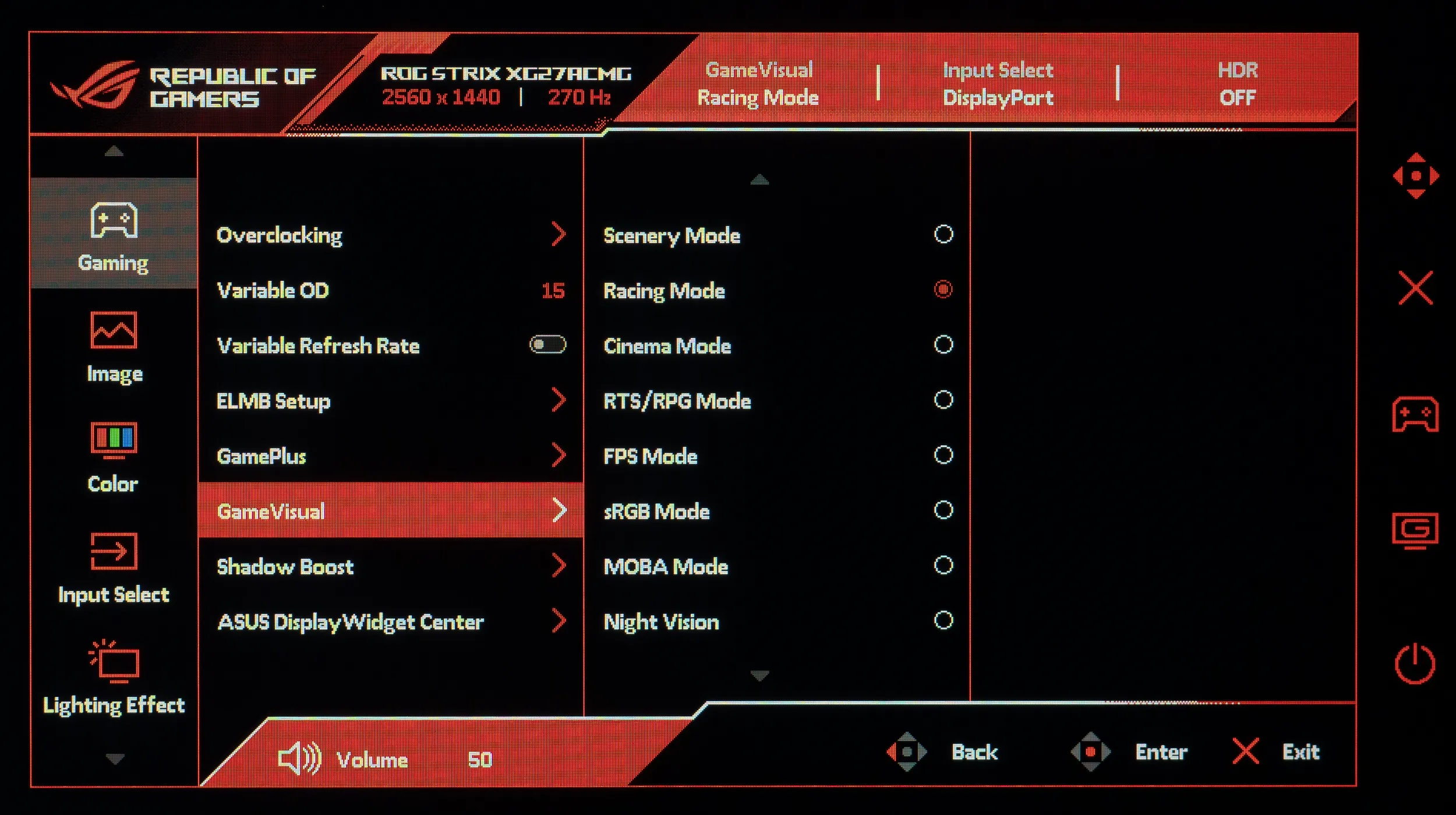 В ASUS XG27ACMG предустановлено восемь основных режимов GameVisual. Впрочем, для наших целей было достаточно заводского режима Racing и возможностей установки рабочего цветового пространства через функцию Display Color Space в соответствующем разделе меню.