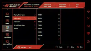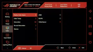 Не менее важные параметры отнесены к третьему разделу, Color. В нём вы можете встретить режимы цветовой температуры и возможность вручную определить степень усиления RGB, также тут доступны пять режимов гаммы и регулировка насыщенности (доступна лишь в определённых режимах). Из относительно новых пунктов — Display Color Space — выбор цветового пространства, без необходимости перехода в режим эмуляции sRGB через Game Visual.