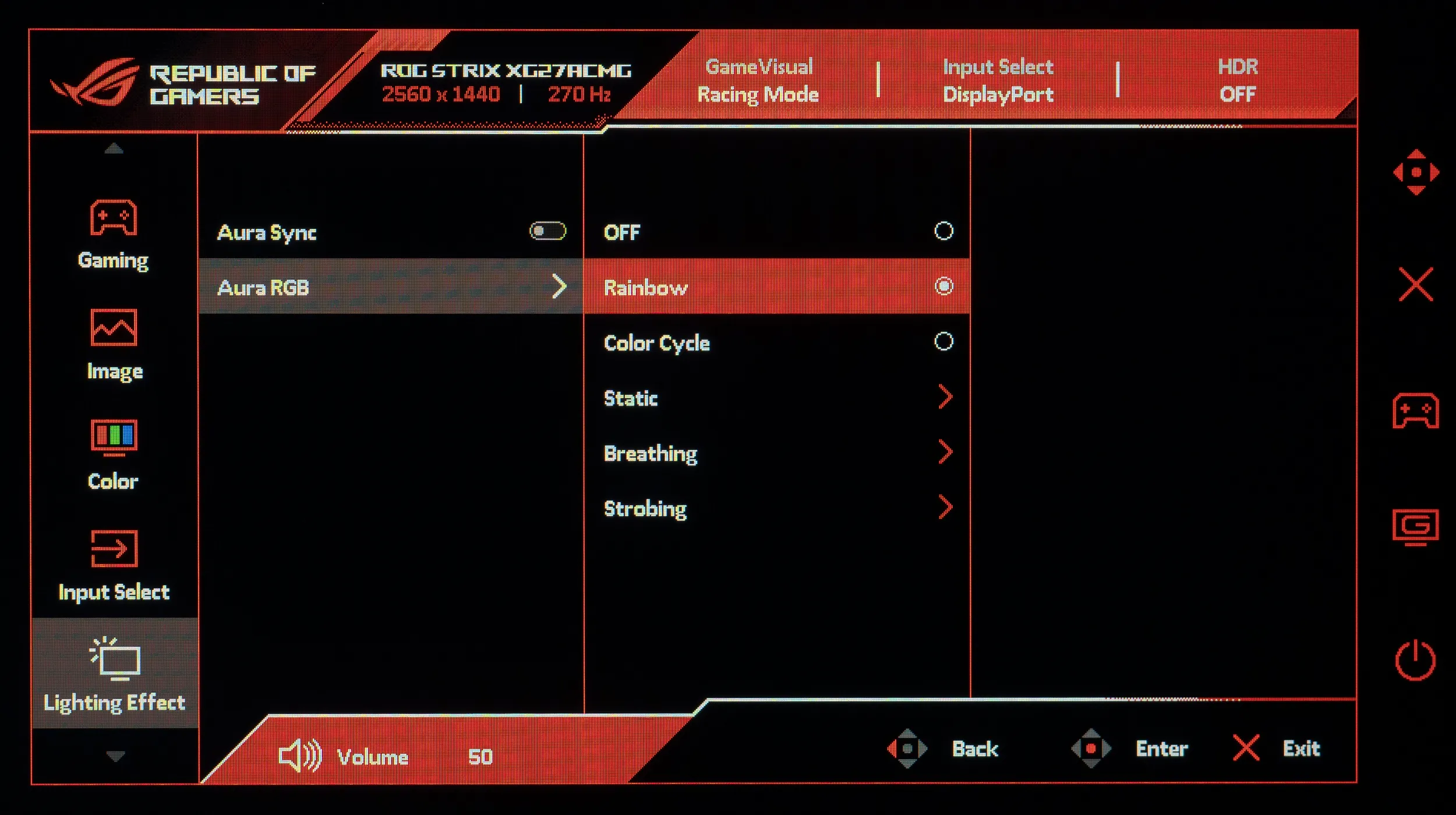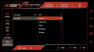 Подсветка поддерживает синхронизацию с другими подобными системами, имеет порядка 5-6 режимов работы и предлагает достаточно широкую цветовую гамму. Впрочем, не следует рассчитывать на то, что Aura RGB в XG27ACMG способна создать эффектный визуальный ряд и сделать некую зону подсветки за монитором для снижения нагрузки на глаза при работе ночью — максимальной яркости для этого точно не хватает. Наблюдать за подсвечиваемым логотипом ROG придётся лишь тем, кто будет стоять или проходить за монитором.