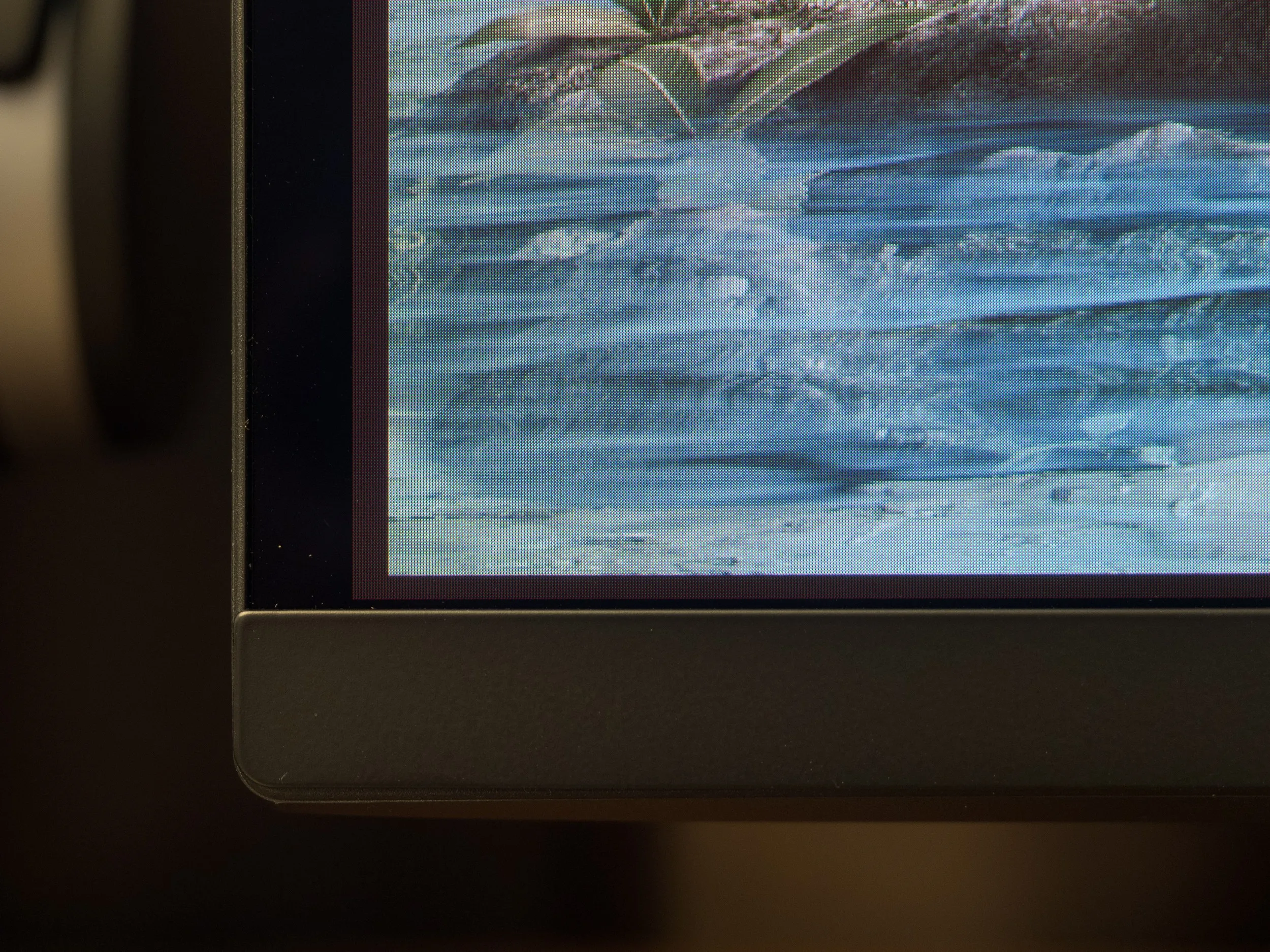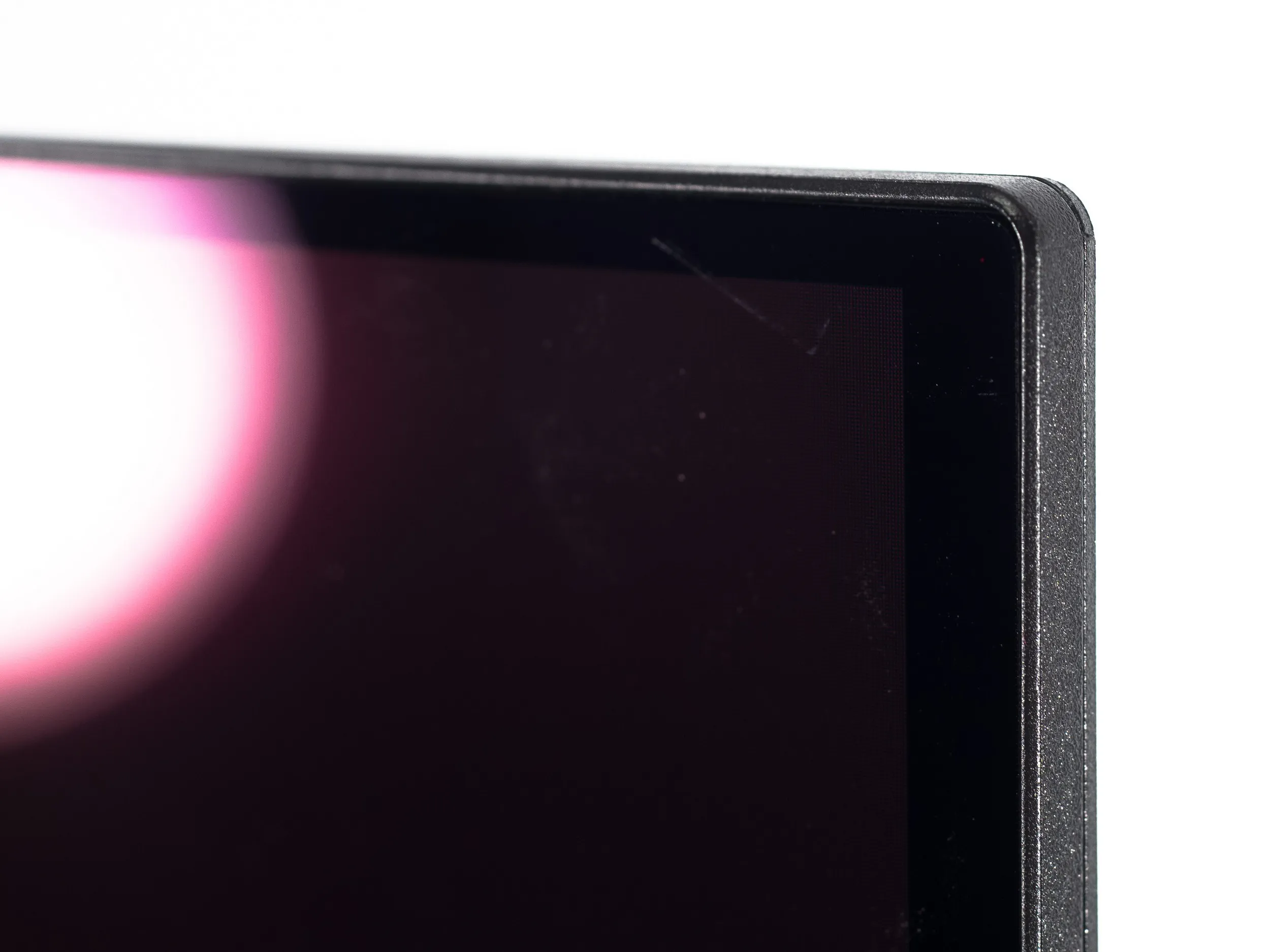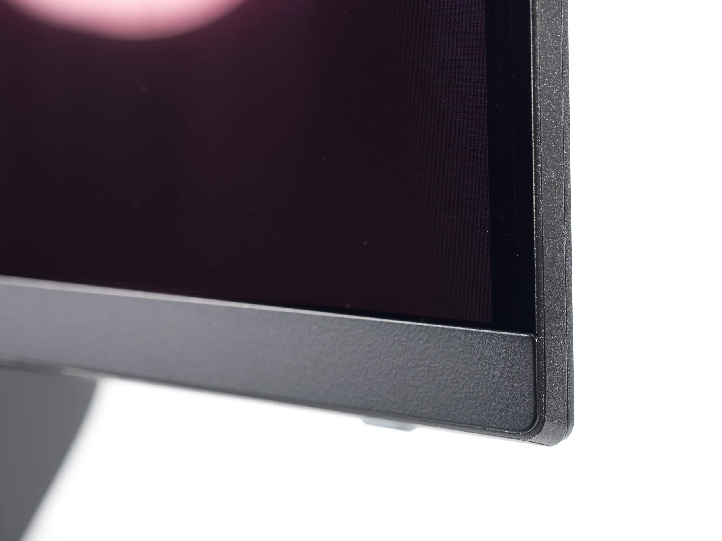 По фотографии выше можно найти подтверждение тому, что монитор обладает классической для современных QD-OLED всех трёх поколений полуглянцевой поверхностью матрицы. Тут вам полное отсутствие кристаллического эффекта, повышенный визуальный контраст, улучшенная чёткость текста и мелких деталей, но далеко не самые лучшие антибликовые свойства (их практически нет) и другая важная особенность наиболее актуальных QD-OLED – розово-фиолетовые паразитный оттенок при появлении хоть какого-то внешнего освещения в месте установки монитора. Ну и чем сильнее поток света, тем быстрее и сильнее выцветает чёрный цвет – становится гораздо менее глубоким, чем в отсутствии внешнего освещения.