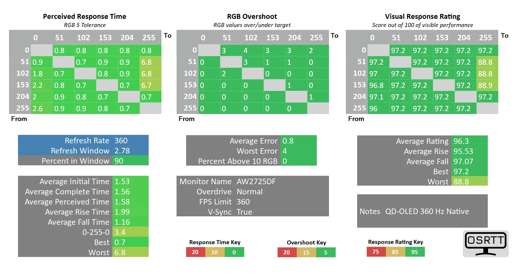 В ходе тестирования аппаратно-программным комплексом OSRTT мы проверили работу монитора лишь на максимальной частоте в 360 Гц. В этом случае среднее фактическое время отклика не превысило 1,53 мс, а самый быстрый переход GtG произошёл за 0,7 мс. Слабые артефакты есть на цифрах, но зрительно мы с ними не столкнулись. Пара проблемных переходов, повлиявших на финальный результат, являются особенностью отработки монитором изменения цвета при выводе картинки на весь экран. Да и в целом, используемое оборудование не слишком предназначено для столь быстрых OLED. В реальности цифры должны быть в несколько раз ниже, но ограничения начинки комплекса OSRTT мешают их продемонстрировать.