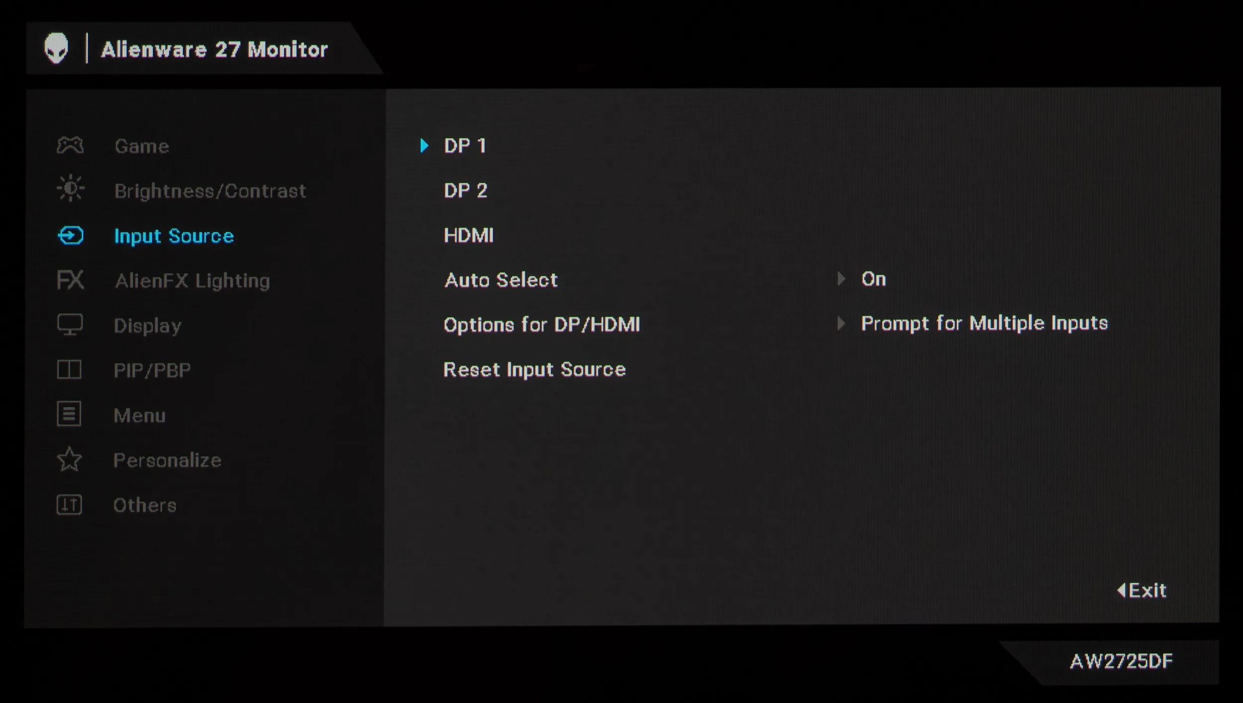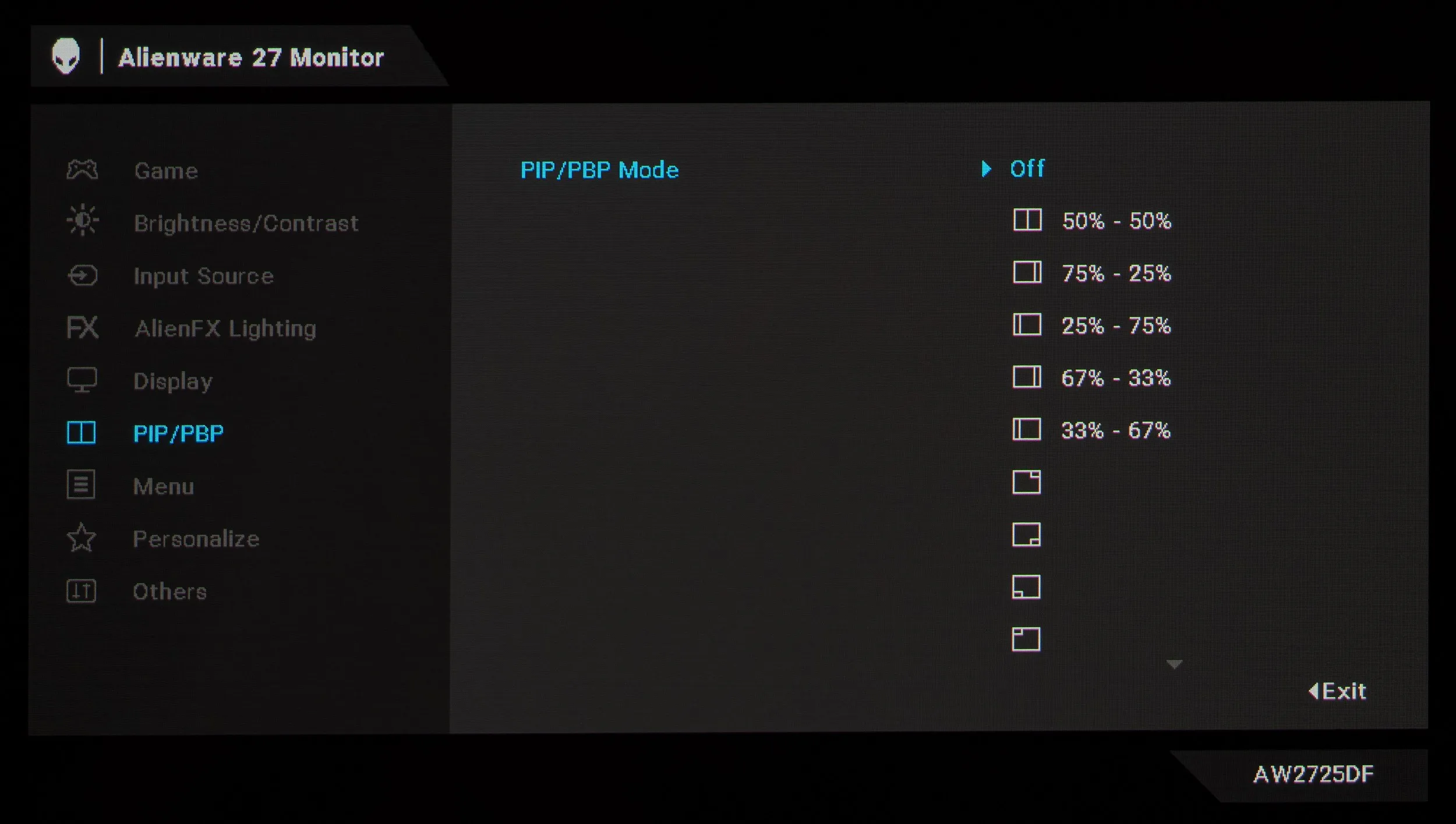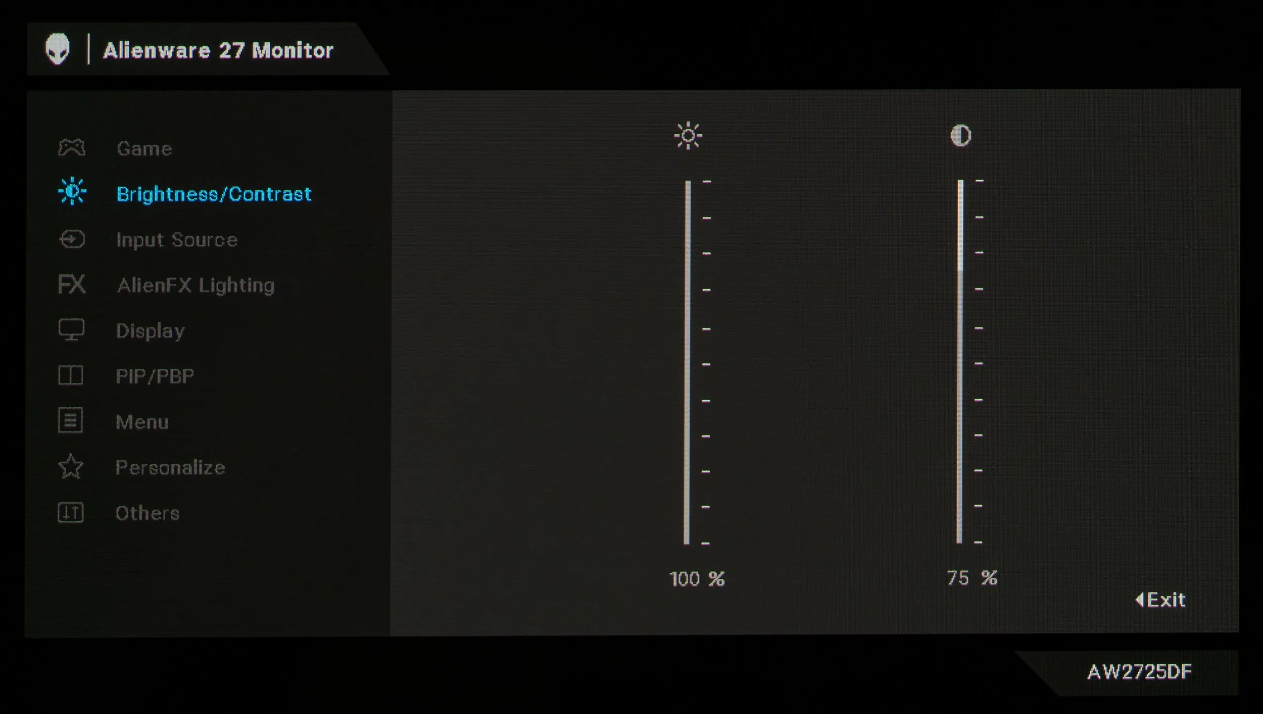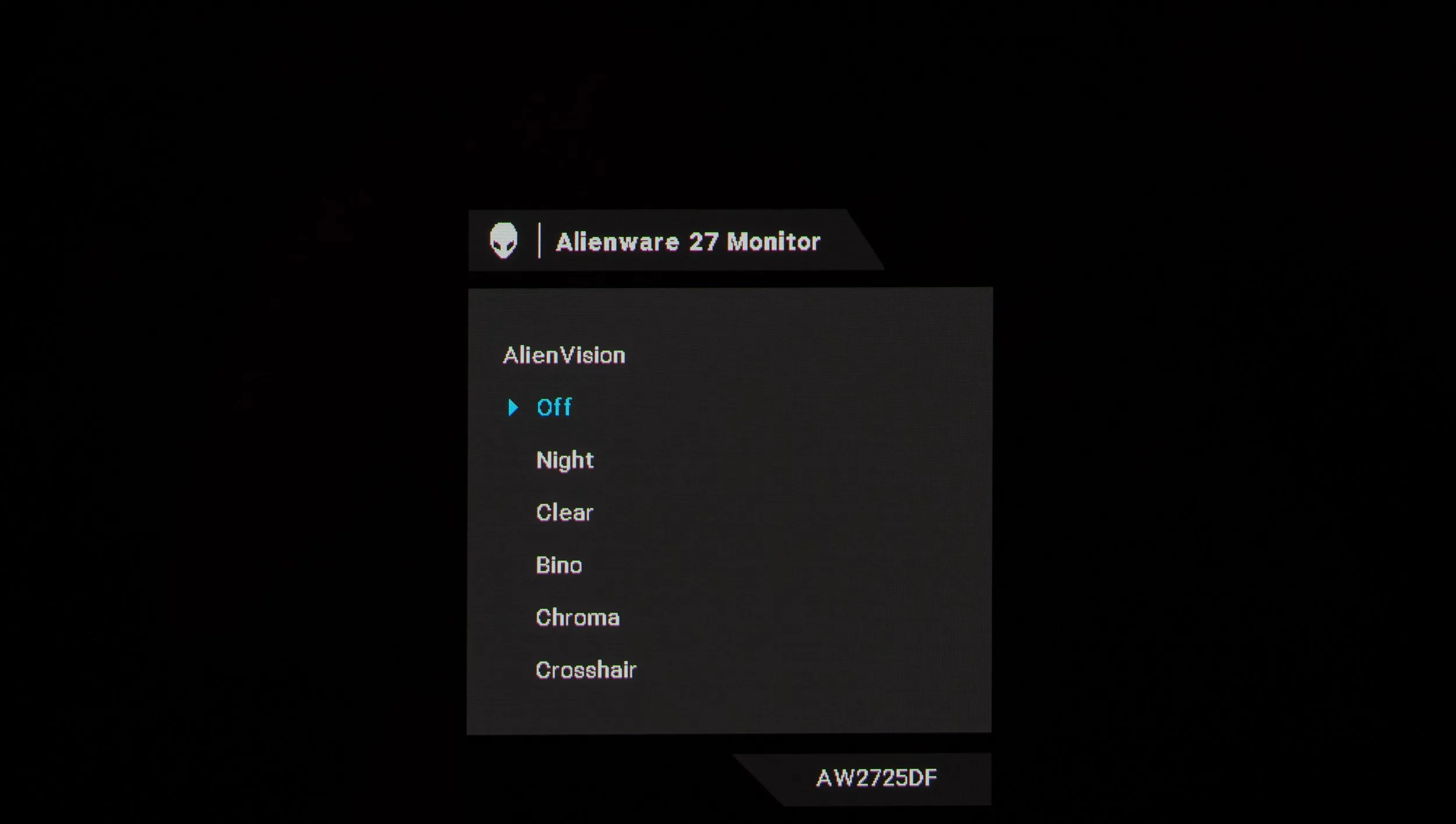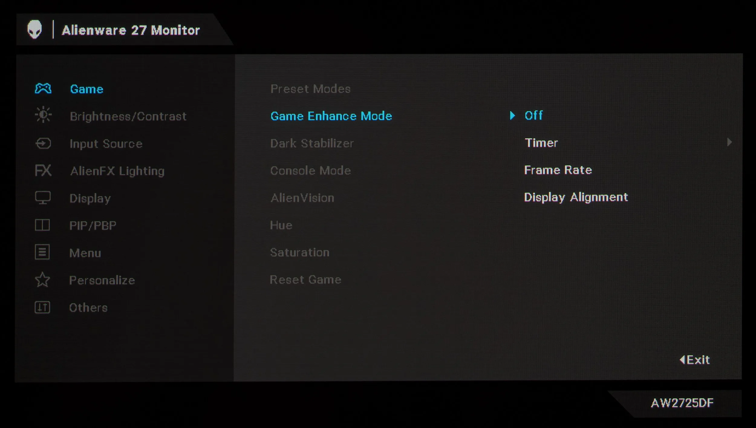 У новинки AW2725DF целых девять разделов меню. Первый раздел отдан под выбор режима цветопередачи, активацию игровых «улучшателей», регулировку различимости крайних тёмных деталей. Есть настройки насыщенности и оттенка, режим настроек при подключении к игровым приставкам, выбор подрежимов уже отмеченной функции AlienVision и сброс настроек к значениям по умолчанию (исключительно из этого раздела).