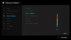 Вместе с тем, система управления монитором сохранилась исключительно за 5-позиционным джойстиком, которому аккомпанирует отдельная клавиша питания монитора. Никуда не делась и система внешней подсветки AlienFX, поделённая в этот раз на 3 отдельно управляемые зоны с возможностью выбора из 19 цветов свечения. Настройке могут быть подвержены: кнопка питания, логотип и номер «опасной зоны».