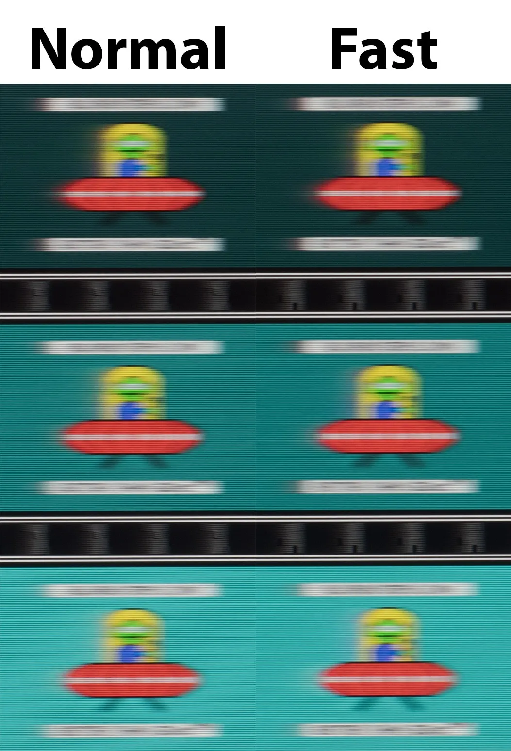 В новинке заявлена матрица со временем отклика в 5-8 мс (в зависимости от режима разгона матрицы), измеренным по методике Gray-to-Gray – классика для рабочих мониторов от Dell, которая перешла и к современным 120 Гц решениям. По умолчанию установлено значение Response Time - Normal. Присутствует второй возможный вариант – Fast. Сравним их между собой: