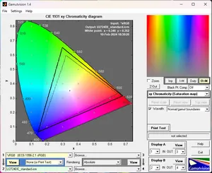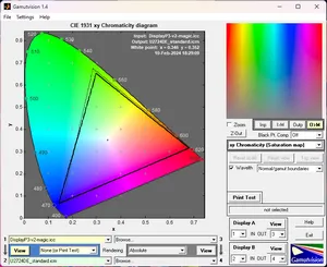 Первоначальная проверка осуществлялась при заводских настройках дисплея (режим Standard). По представленным скриншотам видно, что монитор по своим возможностям превосходит sRGB (для которого производитель заявил 99 % покрытие) на всех основных участках и приближен к полному покрытию DCI-P3.
