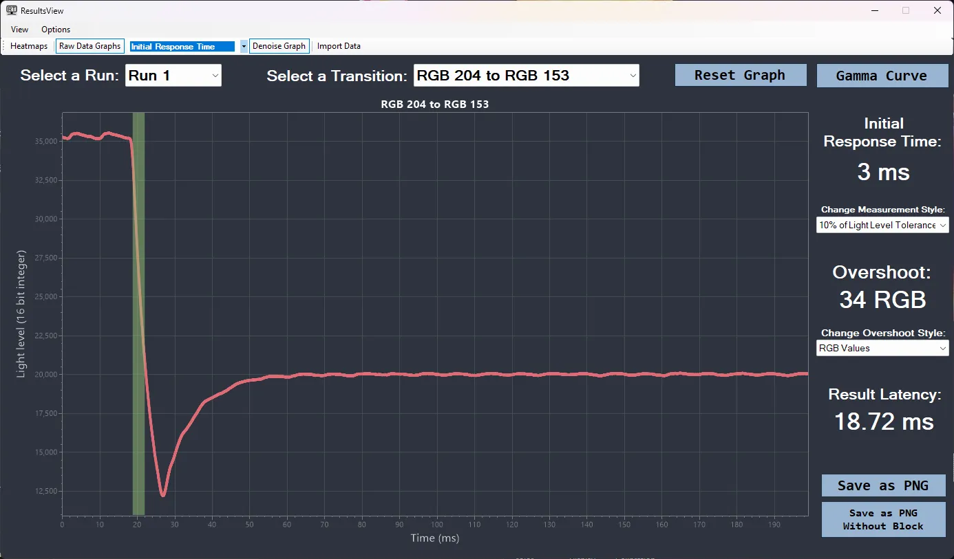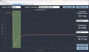 В первом случае продемонстрирован подход производителей мониторов – допуск 10-90 % по уровню яркости, без учёта артефактов, который на данном переходе RGB 204 -> RGB 153 присутствует в полной мере. При такой оценке время отклика составило всего 3 мс.