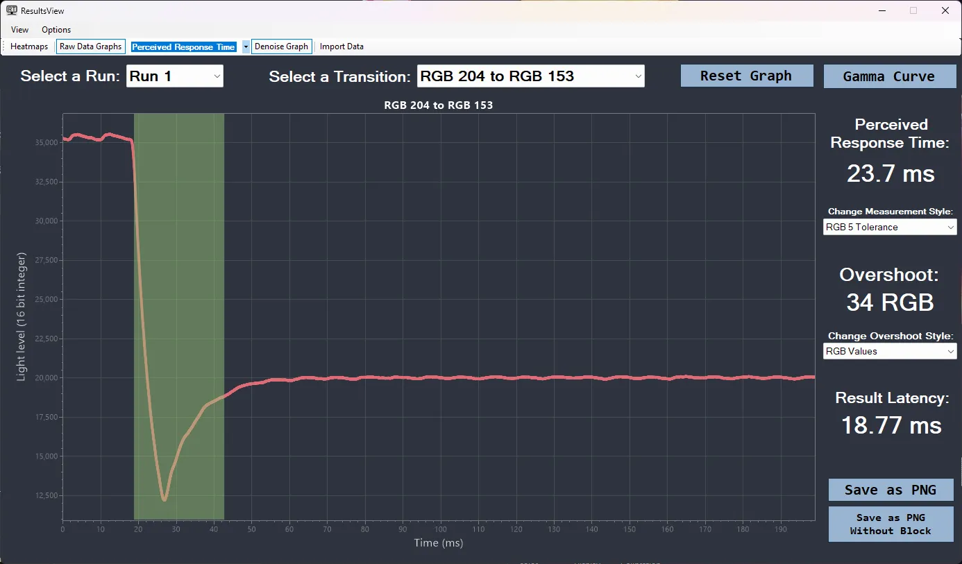На втором изображении продемонстрирован применяемый нами допуск (RGB 5 с коррекцией гаммы) и оценка воспринимаемого времени перехода – то есть установления стабильной яркости для вывода заданного оттенка RGB. В этом случае мы получаем время отклика в 23,7 мс. Разница между значениями – безумна. Но что из них ближе к фактическому времени отклика, как нам кажется, всем очевидно.