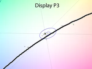 Переход к режиму Custom повторяет данные возможности с крайне высокой точностью, да и активация специального Display P3 не способна повлиять на максимальные возможности матрицы. Выходит, что три режима демонстрируют крайне схожие результаты, по крайней мере при оценке 2D CIE-диаграммы.