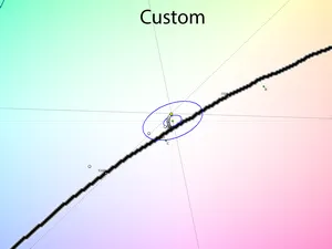 Почти такая же история наблюдается в режиме Custom за исключением несколько иного расположения точек серого клина, сместившихся основной своей массой в область DeltaE<10.