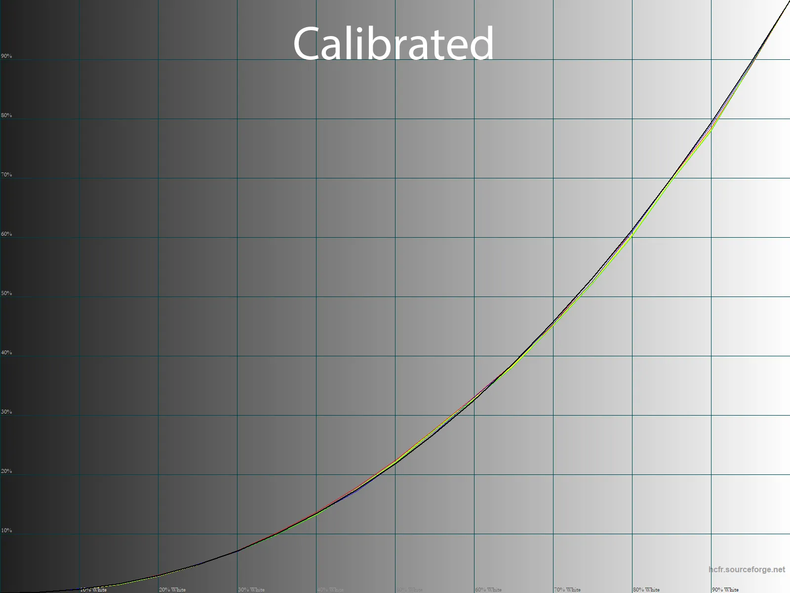 Впрочем, после калибровки с относительно небольшими правками в LUT видеокарты градиенты заметно пострадали. Появилось достаточно большое количество резких переходов в области 5-60% со явными паразитными оттенками (желтый, зелёный). Использование FRC во всей красе!