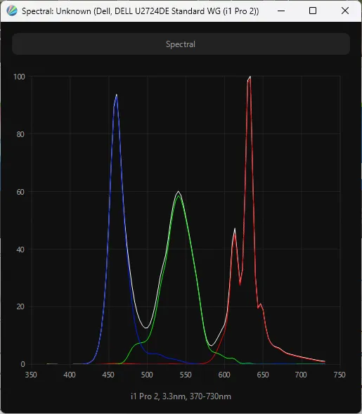 В мониторе U2724DE установлена IPS Black матрица стандарта WQHD с продвинутым вариантом W-LED подсветки, где используется дополнительный слой напыления для модификации спектра подсветки и расширения цветового охвата. Проверим ее цветовой охват на примере новинки от Dell: