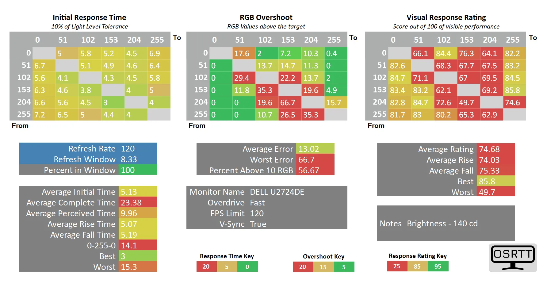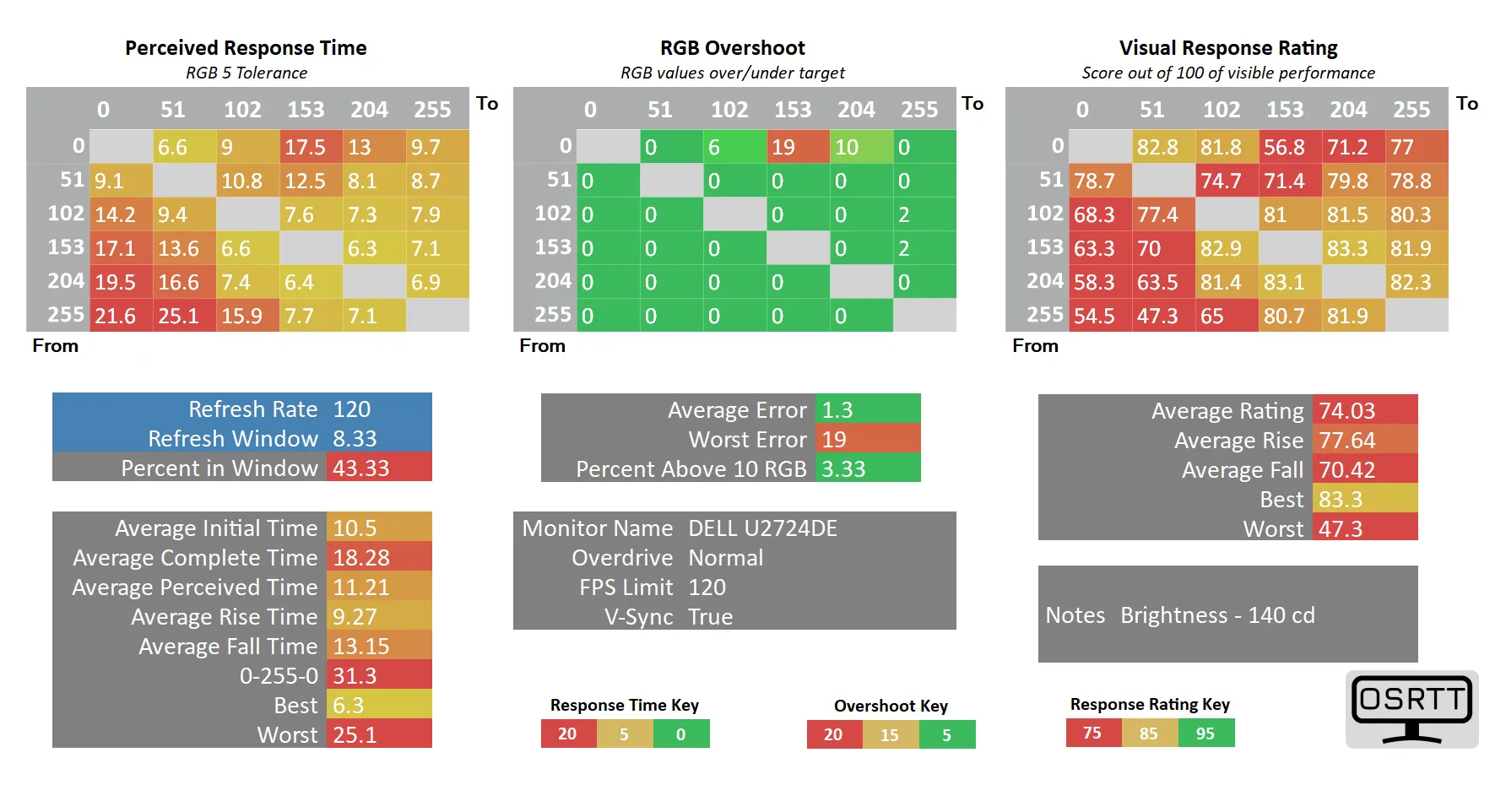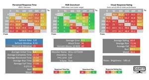 При настройках Response Time (Overdrive в общем понимании) среднее время отклика между различными оттенками серого составило 10.5 мс, но ради этого инженерам Dell пришлось пожертвовать точностью такой настройки – присутствуют слабые артефакты на части переходов. Если же активировать второй доступный режим Fast, то среднее фактическое время снижается до 8.4 мс при достаточно строгом допуске RGB 5 (такой допуск, в некоторых случаях, ощутимо повышает полученные значения, но позволяет гораздо лучше определить реальную скорость дисплея), но с ещё более сильным проявлением артефактов (в среднем с ошибкой до ~10 значений RGB), что можно заметить и по сравнительным фотографиям выше.