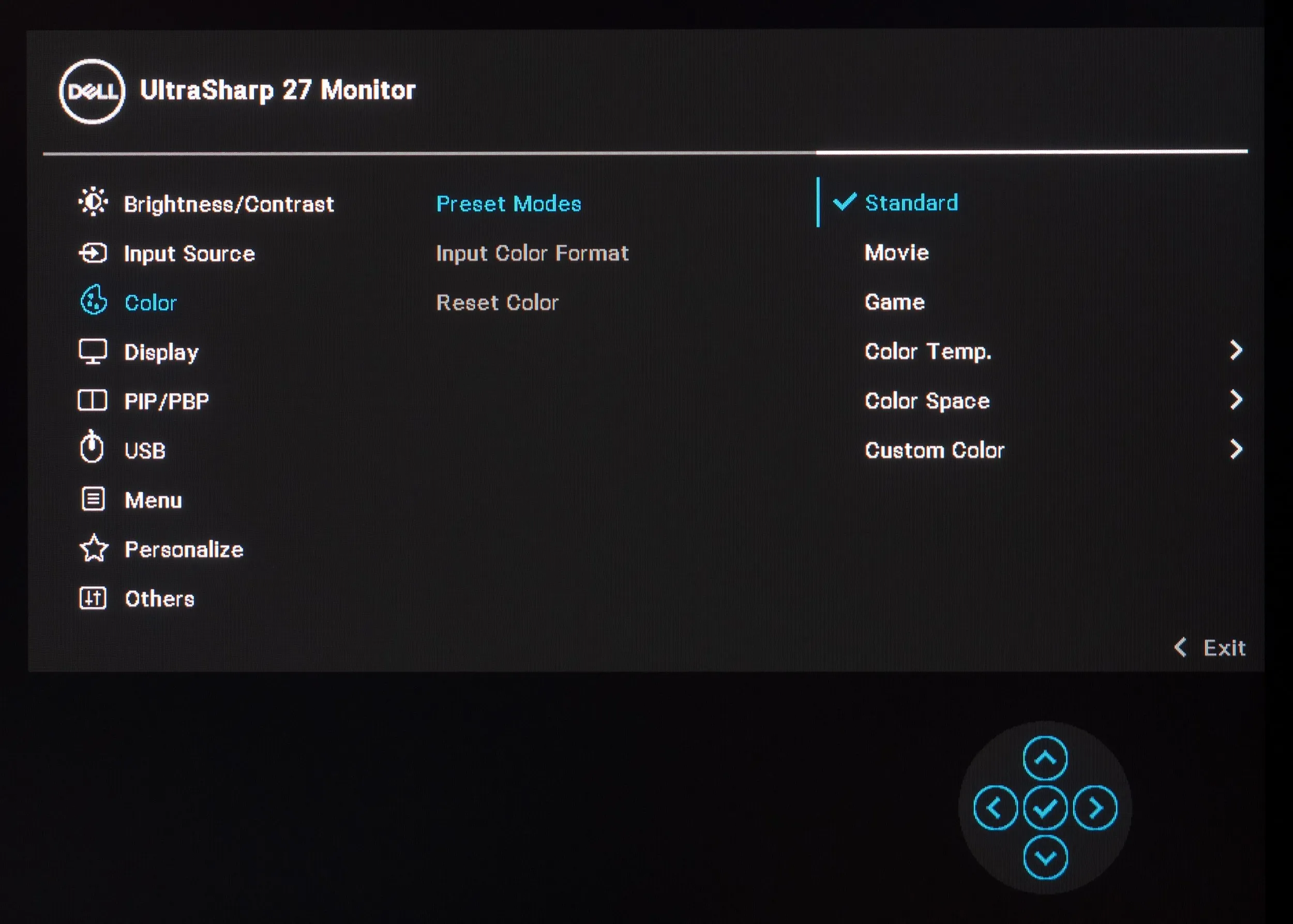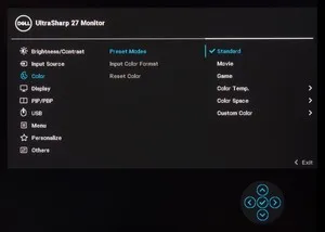 У рассматриваемого монитора присутствует три основных режима (Standard, Movie, Game), режим с выбором цветовой температуры в диапазоне от 5000 до 10000К, четыре режима эмуляции цветовых стандартов, а также пресет для ручной коррекции Custom. По умолчанию же используется Standard Mode со следующими настройками: