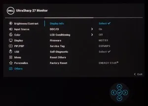 Последний раздел позволяет отключить DDC/CI-интерфейс и активировать функцию LCD Conditioning для проверки экрана на битые пиксели без использования компьютера (удобно при покупке в магазине). Представлен подраздел с рабочей информацией по монитору, также можно вывести сервисный номер и версию прошивки. Опция Factory Reset сбрасывает все без исключения настройки меню к заводским установкам.