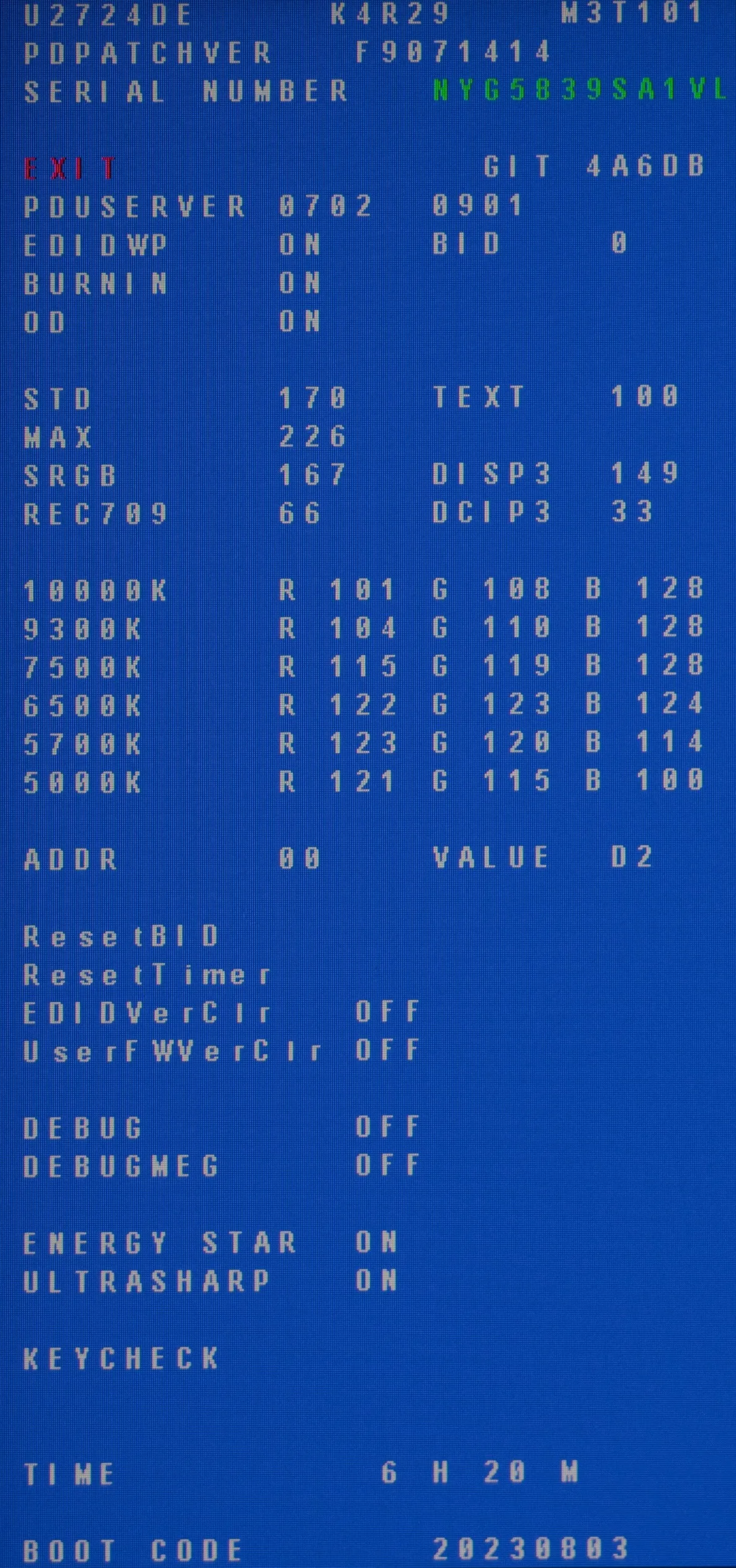 Мы получили доступ к сервисному меню монитора, но, к сожалению, данных с точной моделью матрицы в нём не предоставлено. Зато есть огромное количество другой рабочей информации и счётчик наработанных часов.