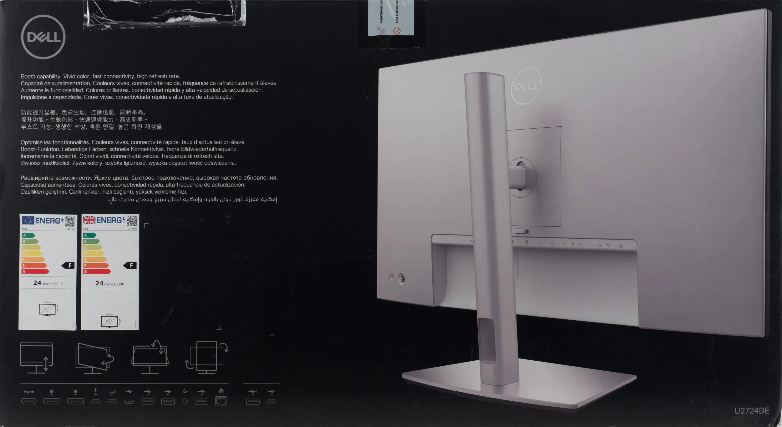 Монитор Dell U2724DE поставляется в большой и тяжёлой коробке из крашеного картона с качественной полиграфией. Монитор показан с двух сторон, указаны все его основные достоинства.