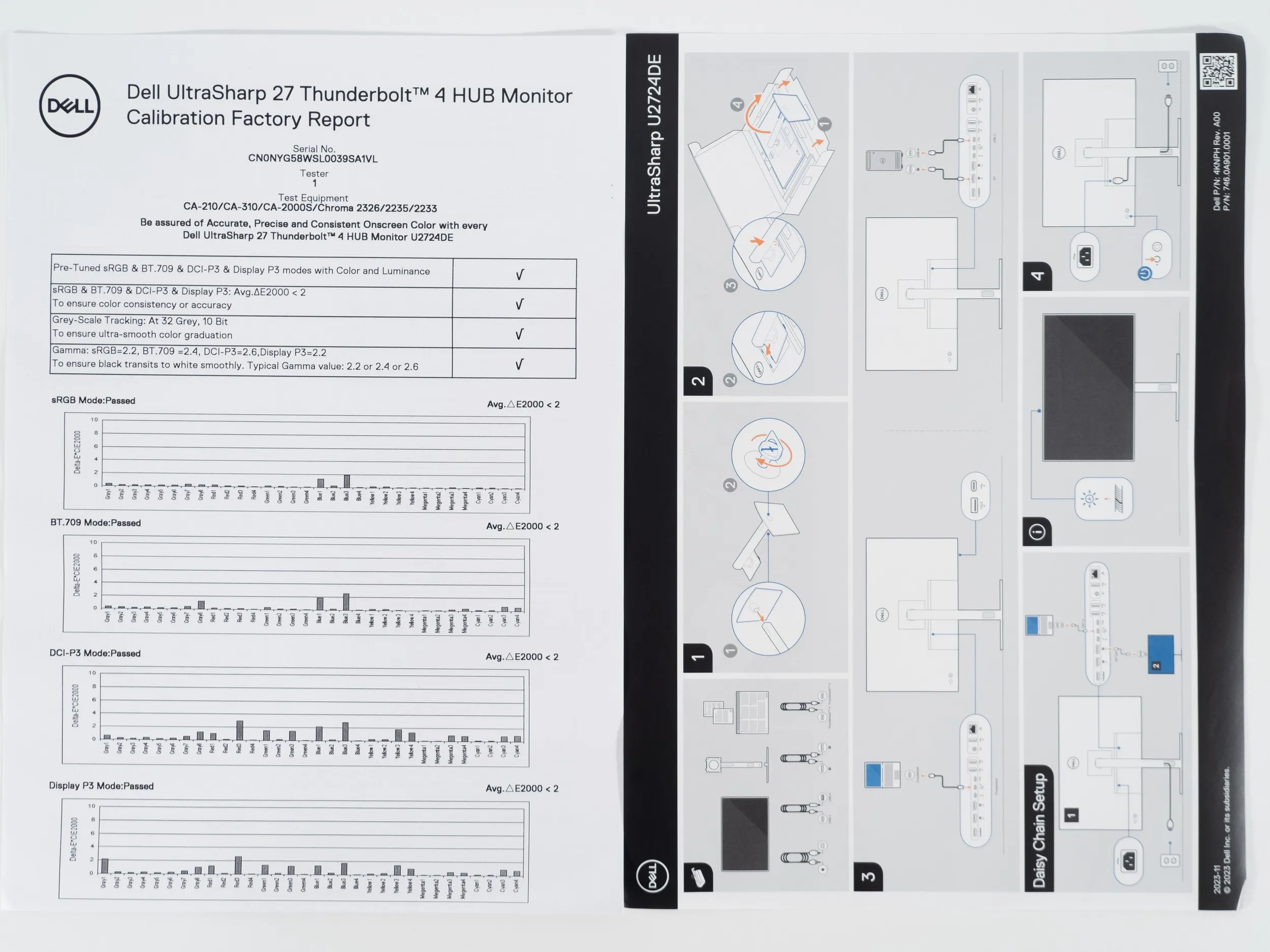 Отчёт о заводской калибровке обещает нам качественно преднастроенные режимы sRGB, Rec.709, Display P3 и DCI-P3, а также низкие отклонения DeltaE2000 для каждого из них. Стоит отметить, что уровни гаммы в каждом из них отличаются: 2.2, 2.4 и 2.6 соответственно. В последнем случае это самое что ни на есть правильное представление стандарта DCI-P3, на которое, впрочем, никто не ориентируется – в обиходе производителей мониторов в 99 % случаев акцент сделан на так называемом Display P3 – аналоге DCI-P3, но с привычной гаммой 2.2. Такой у монитора U2724DE имеется и именно на нём мы сделаем отдельный акцент в ходе тестирования, обойдя стороной DCI-P3.