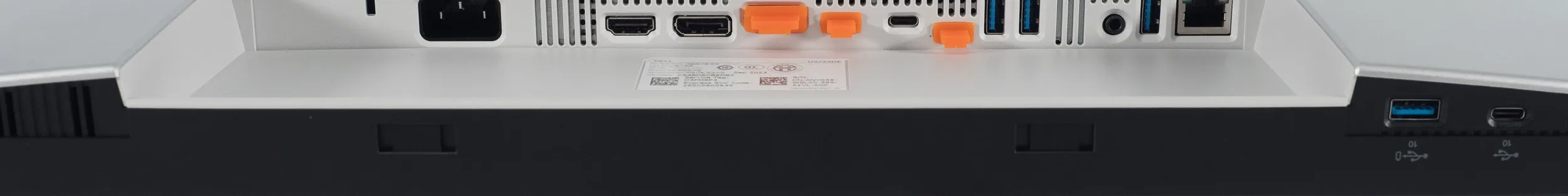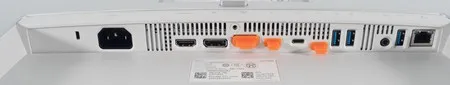 В задней части монитора на колодке для подключения кабелей находятся основные разъёмы, ориентированные вниз. Часть из них, отвечающие за последовательное подключение, закрыты заводскими силиконовыми заглушками оранжевого цвета.