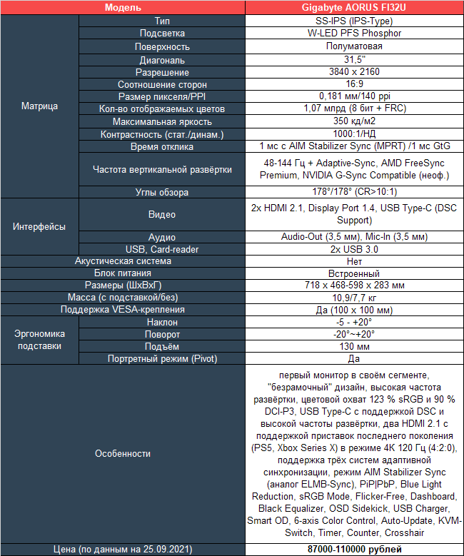 Главными же особенностями FI32U выступают совершенно другие характеристики: 144 Гц без необходимости активации цветового сжатия (но обязательно наличие видеокарты начиная с GTX 2060), высокий отклик в 1 мс GtG, поддержка системы «вставки чёрного кадра» AIM Stabilizer Sync (возможность одновременной работы с системами Adaptive-Sync), наличие целых двух портов HDMI 2.1, полноценного USB Type-C для передачи сигнала (с поддержкой высокой частоты!) и, конечно, поддержку AMD FreeSync в версии Premium и NVIDIA G-Sync Compatible, но пока еще без официального подтверждения со стороны «зелёных».