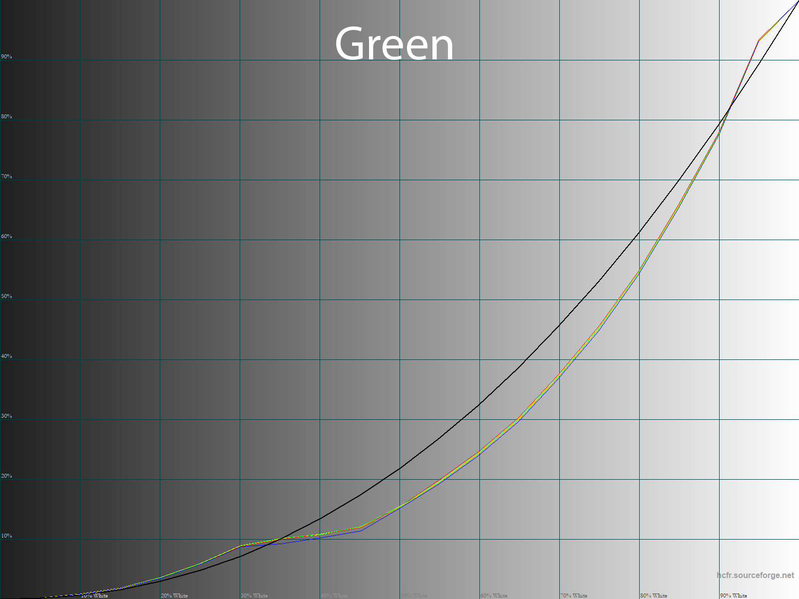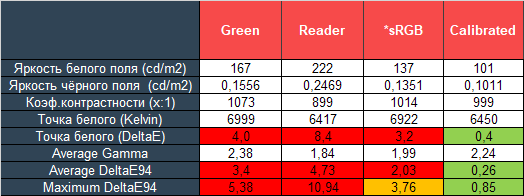 Для тестирования мы выбрали лишь некоторые из доступных режимов. С завода производитель придерживается новым требования по энергопотреблению, а поэтому в качестве выбора по умолчанию производитель установил новый режим Green. В нём яркость заблокирована на уровне 167 нит, включена система локальному управления подсветкой и адаптивная настройка гаммы. Вместе с этим на среднем уровне настроена точка белого, значительно увеличена контрастность изображения, а общие показатели точности цветопередачи вышли в красную зону.