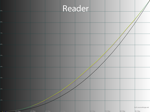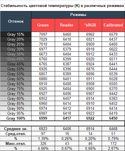 Режим Reader оказалось настроен не совсем так, как нам бы хотелось. В нём цветовая температура находится на уровне 6500К с зеленоватым паразитным оттенком и идеальной стабильностью ЦТ оттенков серого. Гамма-кривые равномерно подняты относительно референса, что значительно снижает контрастность картинки и нагрузку на глаза при работе со слабым внешним освещением.